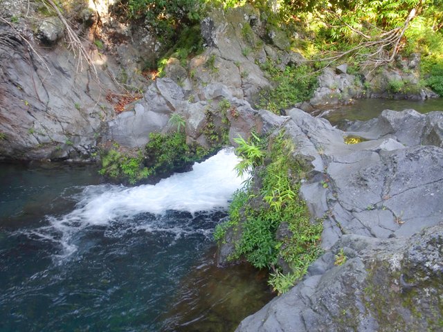 Modeste cassure dans la basalte de la rive droite de la ravine déchiquetée. Il faudrait ramper pour passer dessous.