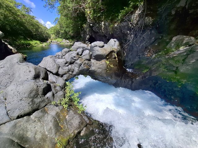 C'est plus un trou dans le rocher issu de l'usure d'une marmite qu'une véritable arche naturelle mais sa beauté et sa régularité lui ont valu une place sur cette page. Peut très bien exploser lors de fortes crues dues à un cyclone en recevant un galet entrainé par le courant comme cela semble être déjà la cas.