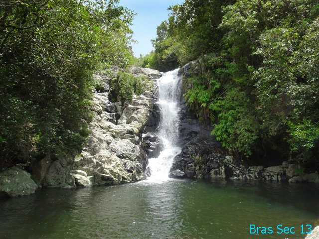 Cette fine cascade est alimentée par le Bras Long qui coule à la Mare. Malgré un petit bassin, on ne s'y baigne pas puisqu'on vient de traverser déjà 20 fois la rivière et qu'on n'éprouve plus de plaisir à se mouiller !
