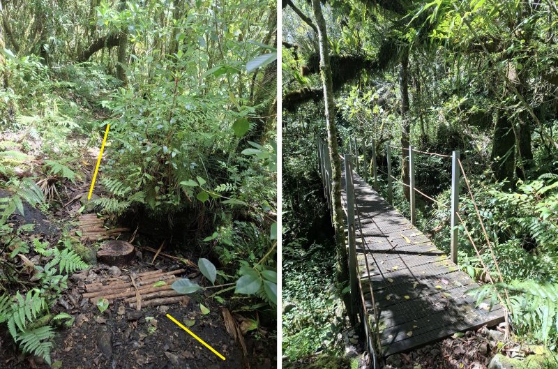Réalise le 30/01/26 - Début du sentier visible près d’un école abandonné avec panneau qui met en garde face à votre responsabilité sur la poursuite du parcours .( voir photo 1 ) Une premier passerelle se présentera ( voir photo 2) contournable par la gauche . Le sentier longe à flanc de falaise et tres proche du vide de la ravine et se repère par le long tuyau . ( voir photo 3 ) Un petit pont assez stable se présentera avant lavant dernière passerelle ( voir photo 4 ) la plus risqué avec un espace pour contourner qui pass au dessus du vide et qui ne laisse passer qu’une personne . Préparez vous pour la descente presque raide avec 4 racines comme prises . Le sentier se poursuit sur du plat attention aux zones humides et glissantes qui ne pardonnent pas
