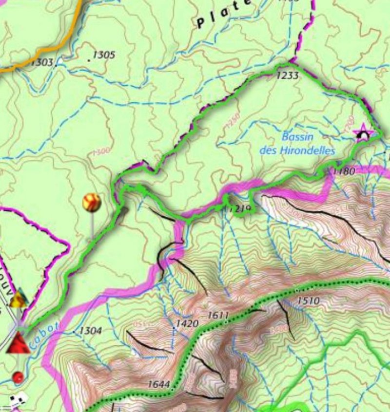 Bonjour. Première visite en ce qui me concerne au joli Bassin des Hirondelles hier 1er février ! Le sentier etant officiellement fermé, et pris de scrupules, nous avons préféré le quitter après moins d'un kilomètre, et rejoindre le Bassin des Hirondelles en descendant une petite ravine puis le bras Cabot (carte photo 1). Magnifique variante avec cascades, bassins, contournements touffus, et passages plus paisibles. A réserver aux aventuriers...Nous sommes rentrés par le sentier, celui ci n'étant pas fermé dans l'autre sens. Avec Martial, Oremus, Gazelle, et Michelpey.