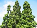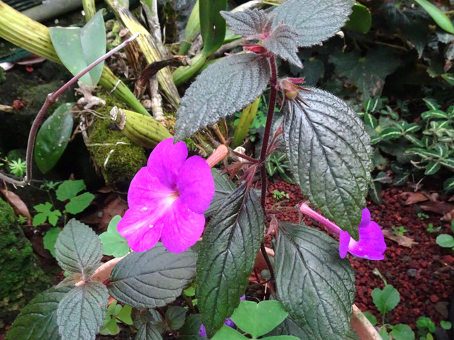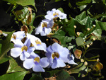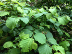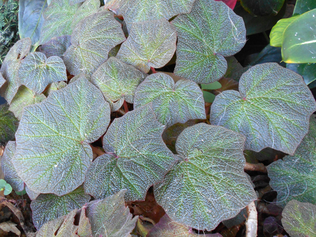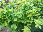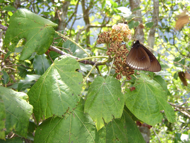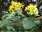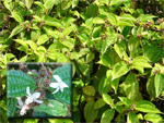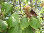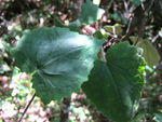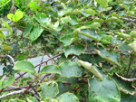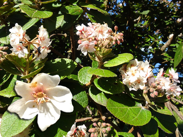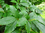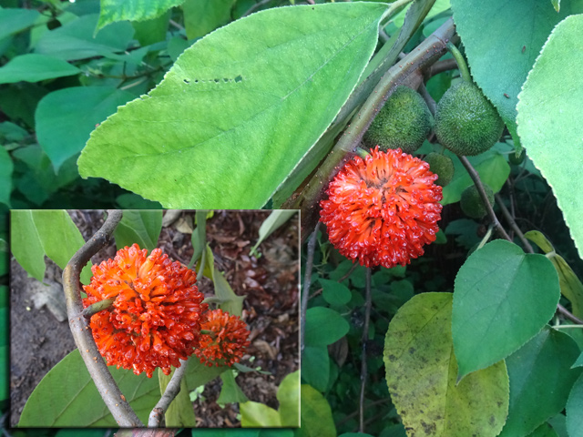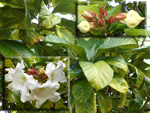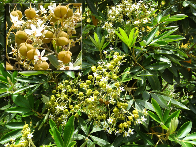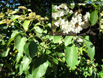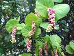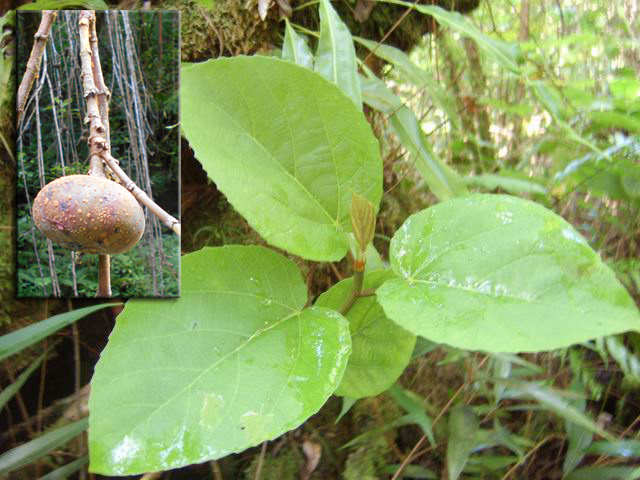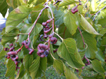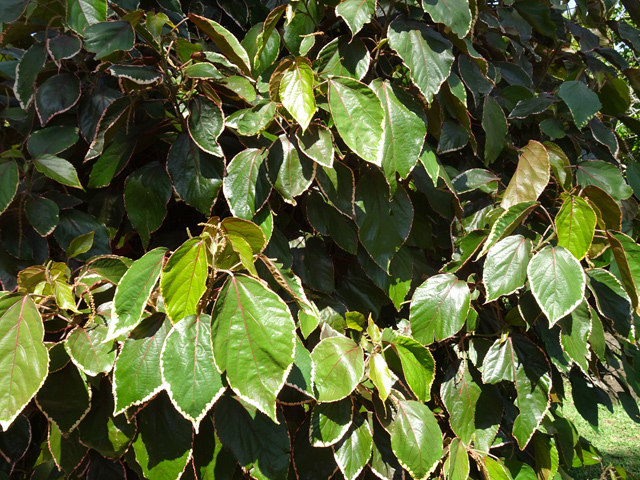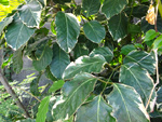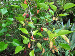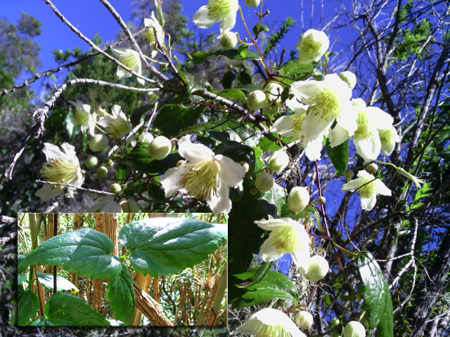 Arbre endémique se raréfiant, protégé, photographié ici dans un jardin botanique. Il pousse jusqu'à 1000 m et peut atteindre 10 m. Les feuilles caduques en forme de cœur sont finement dentées. Les feuilles juvéniles sont très différentes des adultes. Les fleurs mâles à 5 pétales blancs bleuté sont en fin de rameau. Elles sont regroupées par dizaine