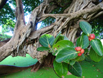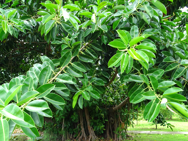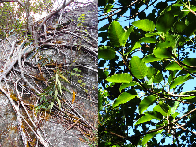 Surtout connu pour ses impressionnantes racines étrangleuses tentant d'étouffer gros arbres ou rochers, ce figuier indigène d'une dizaine de mètres est assez commun. La feuille, peu caractéristique, ovale permet difficilement de reconnaitre l'arbre. Les fleurs naissent par deux à l'aisselle des fleurs. La petite figue est rouge-brun. Certains figuiers atteignent des tailles remarquables