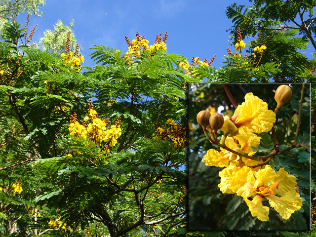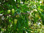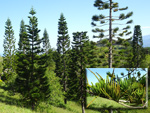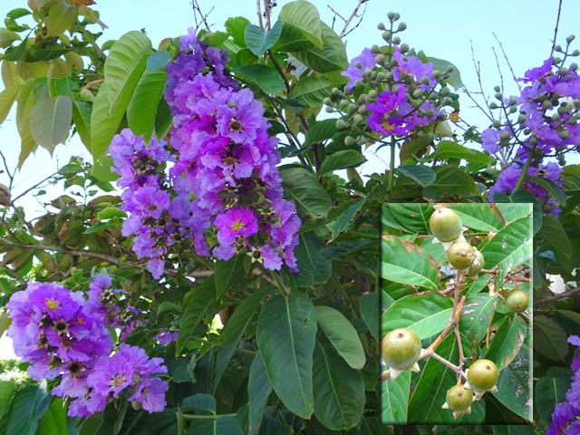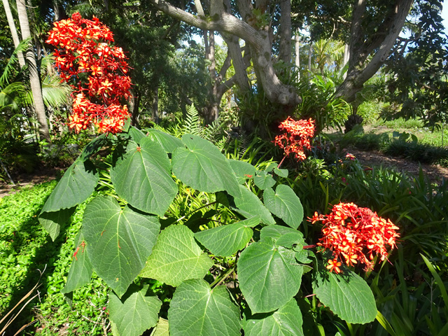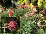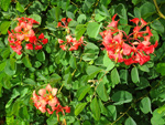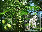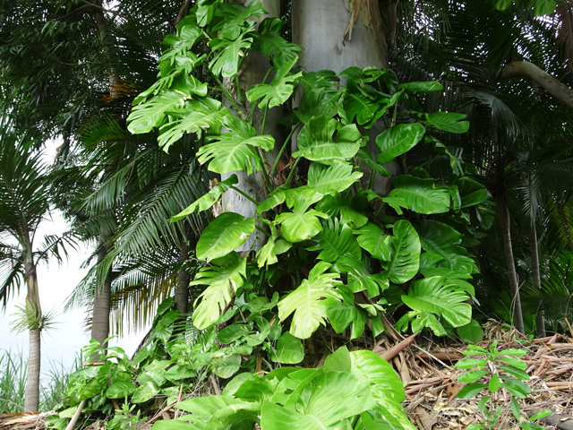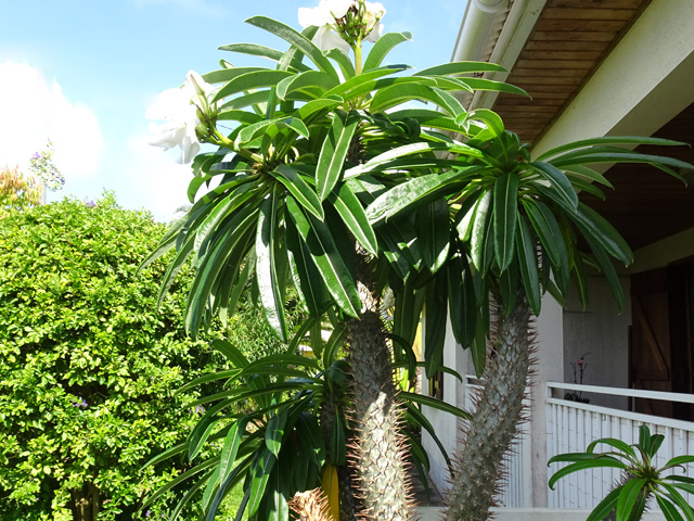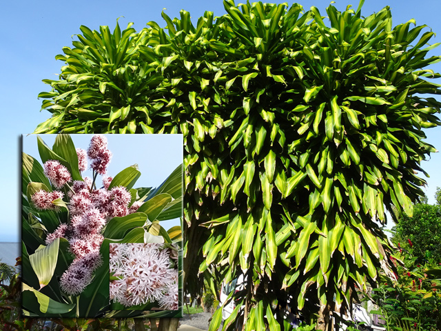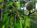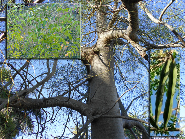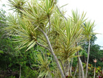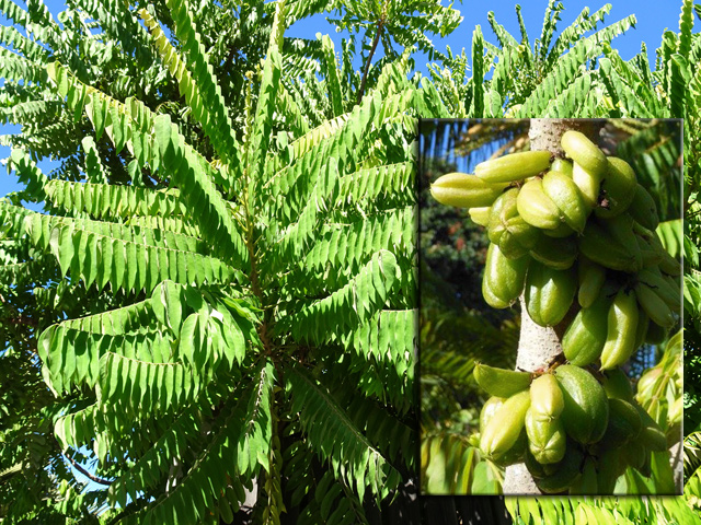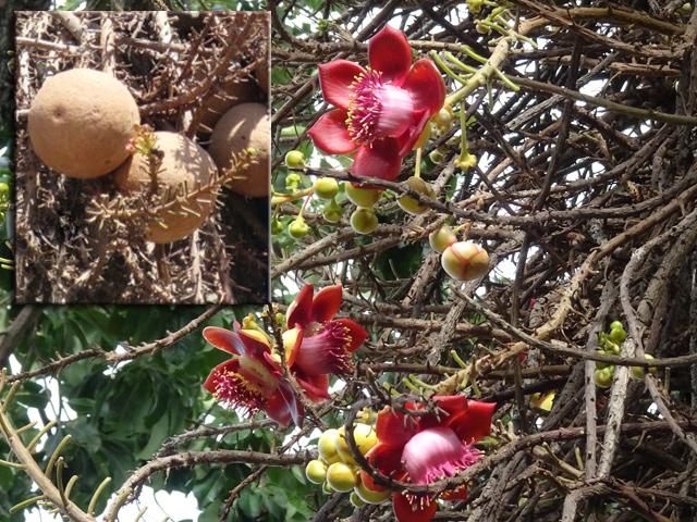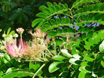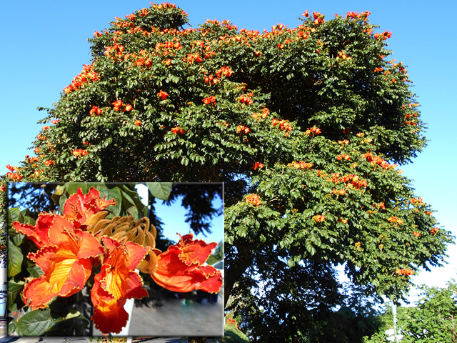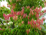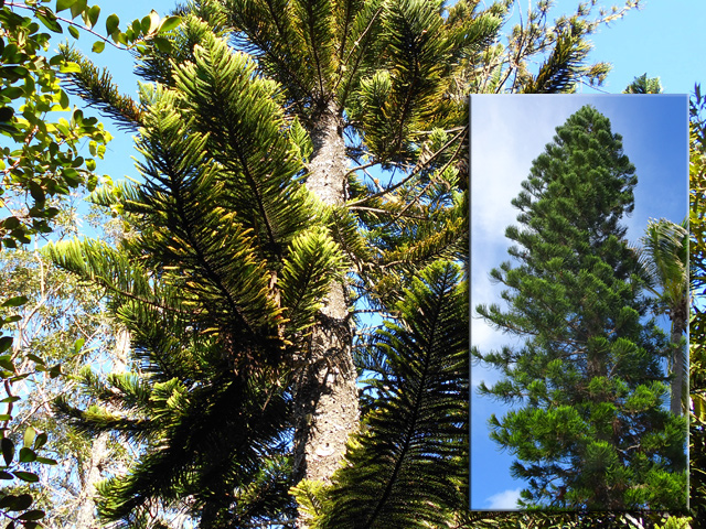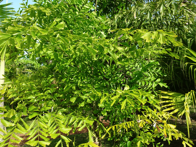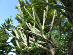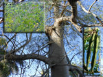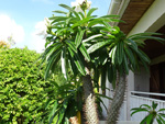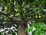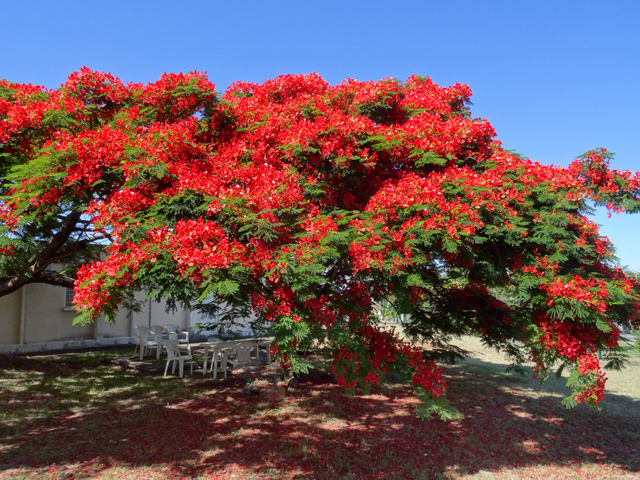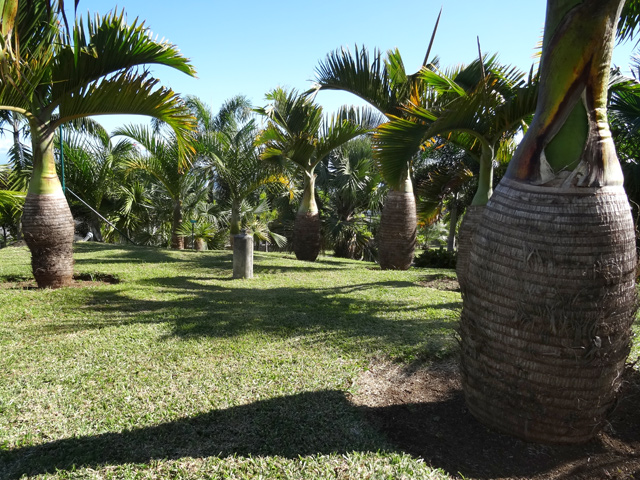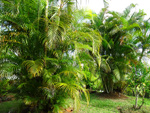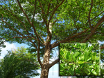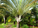 Un autre grand classique des régions tropicales qu'on trouve encore près des anciennes grandes demeures où il borde les allées. Il atteint souvent les 25 m. Les stries horizontales du tronc proviennent de l'empreinte des anciennes feuilles.