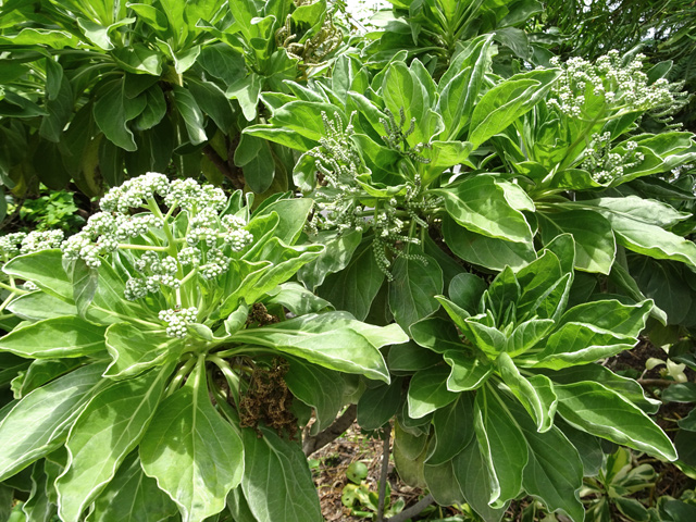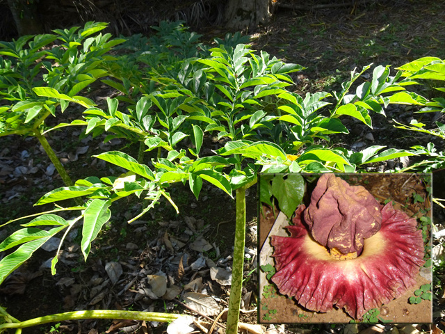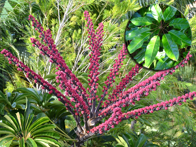 Fréquent dans les zones où vit Badula barthesia. Il n'est généralement pas ramifié. Les grandes feuilles sont toutes groupées en spirale en fin de rameau. Il ne peut se manquer lorsqu'il est en fleur car les fleurs blanc-rosé s'implantent entre l'emplacement des feuilles anciennes et les nouvelles qui sont roses et presque transparentes. Il comporte plusieurs espèces sur l'île, toutes endémiques.