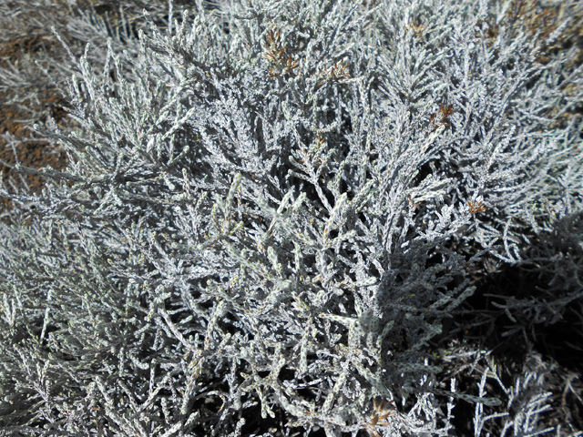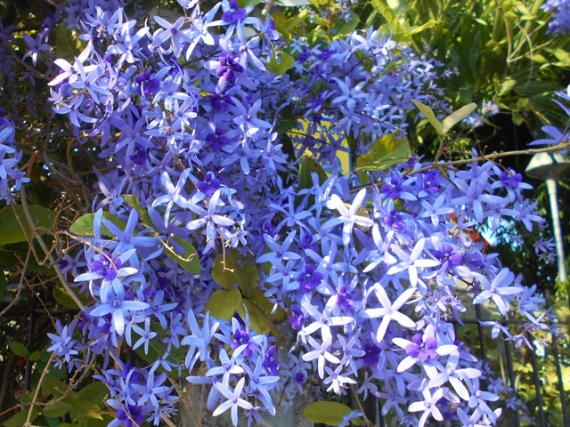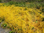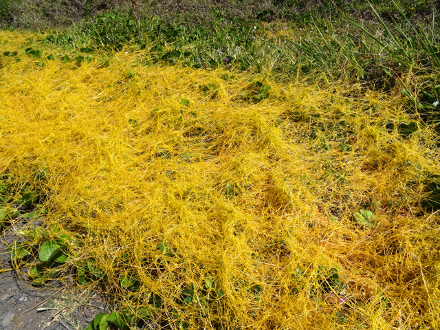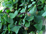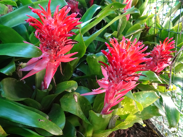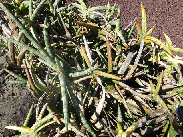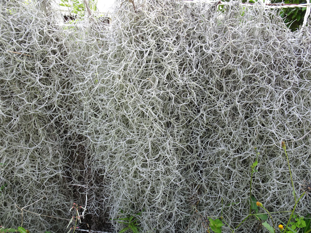 Originaire d'Amérique du Sud, cette barbe espagnole finit à la Réunion sur des clôtures grillagées ou pendant des branches au jardin. Cette épiphyte des contente de peu en absorbant le calcium de l'eau de pluie. Elle est grise et devient verte une fois mouillée. Difficile d'apercevoir ses minuscules fleurs à trois pétales jaunes.