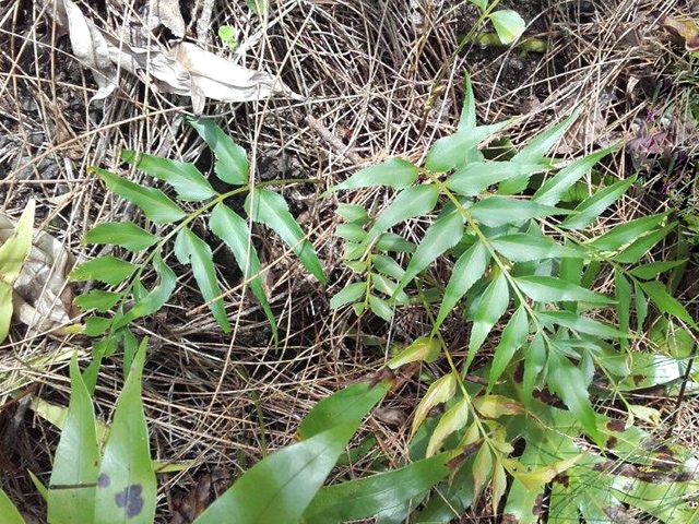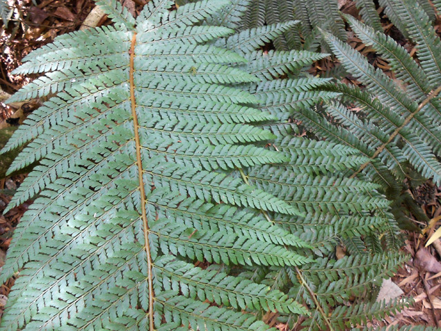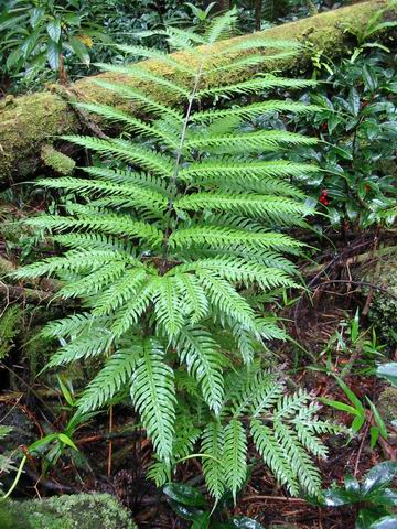 Cette belle fougère assez commune dans les bois de tamarins se rencontre dans les forêts humides des hauts. Elle se reproduit par rhizome long et souterrain. Le pétiole, légèrement bleuté en début de pousse lui a valu le nom vernaculaire de fougère bleue. Les pennes sont opposés et les frondes assez longues. Certaines de ces fougères, en milieu sombre, peuvent atteindre plusieurs mètres.