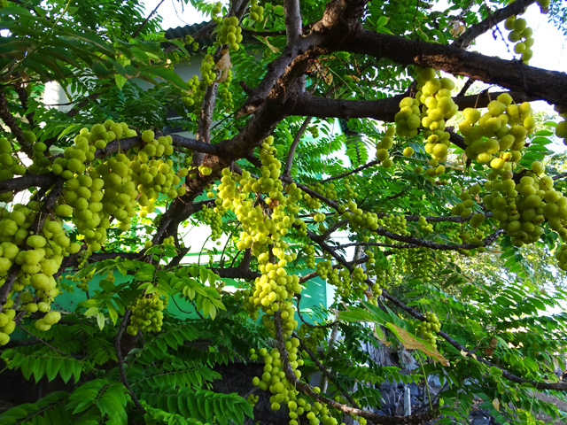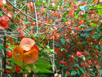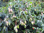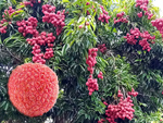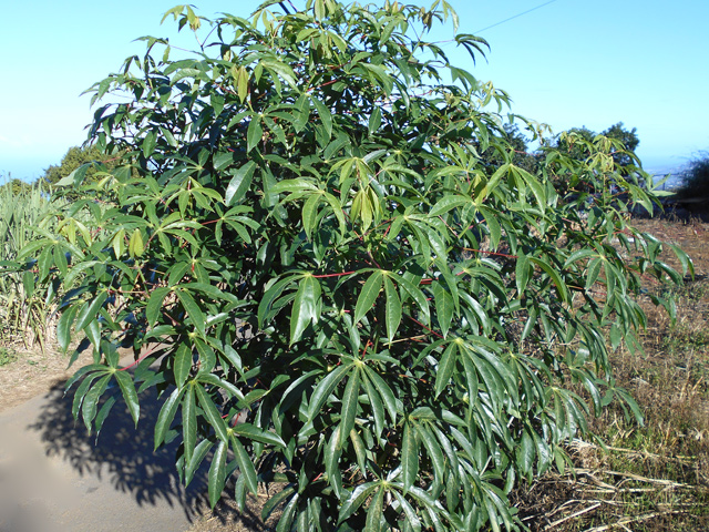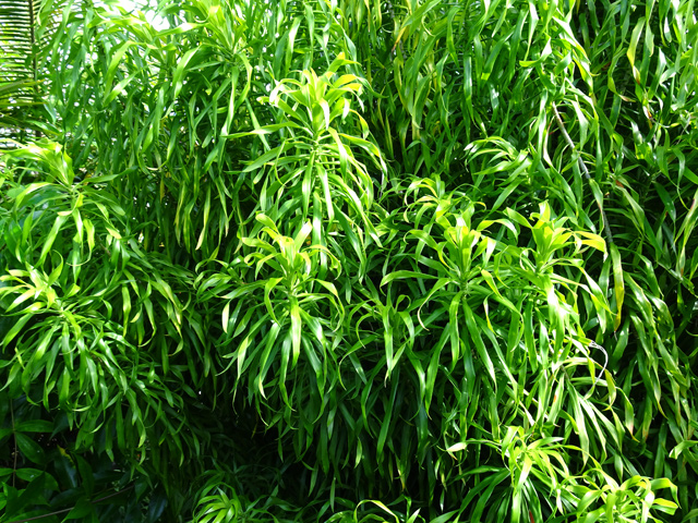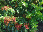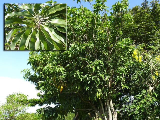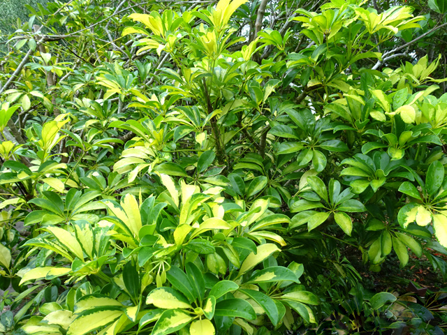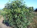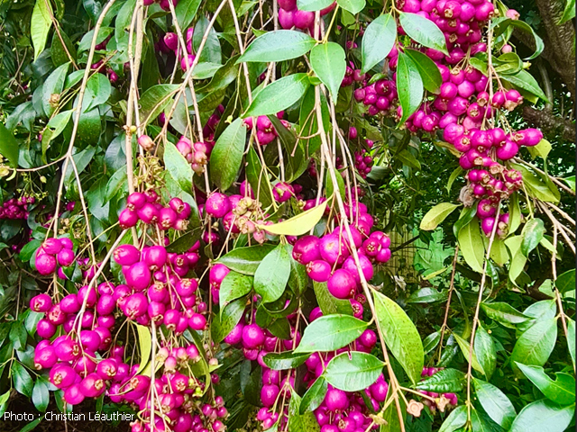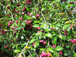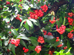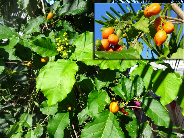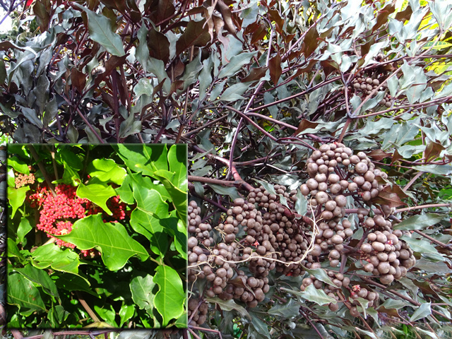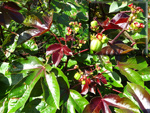 Classique des haies et massifs dans les jardins réunionnais, l'arbre du bonheur peut créer de véritables murailles végétales impénétrables. Elle supporte très bien des tailles régulières. Les feuilles du bas tombent tandis que celles du haut poussent. Grosses grappes de fruits orange.