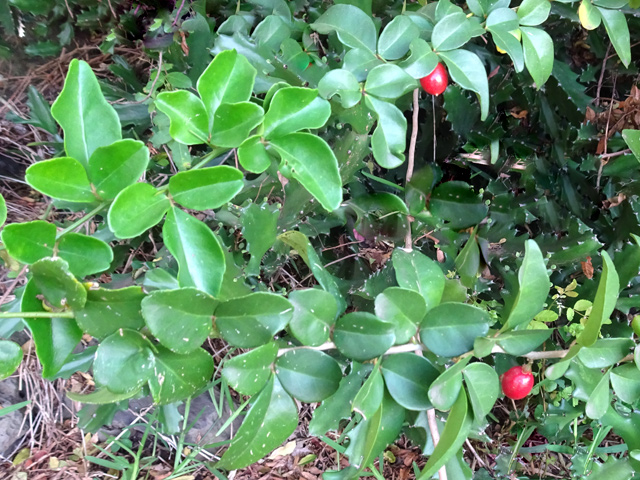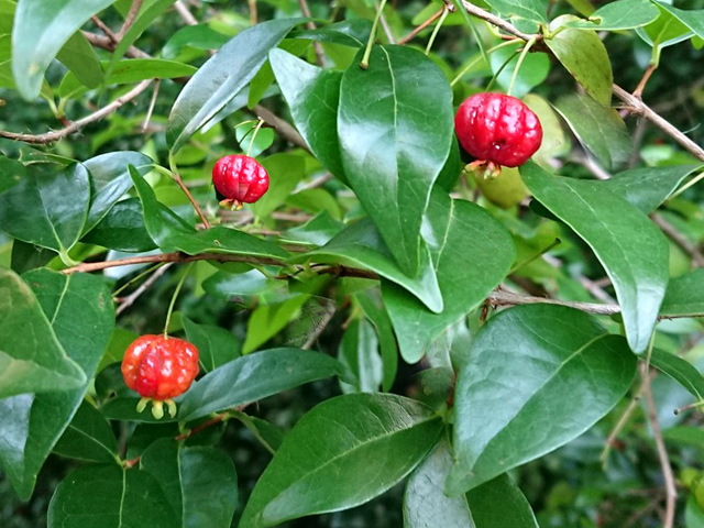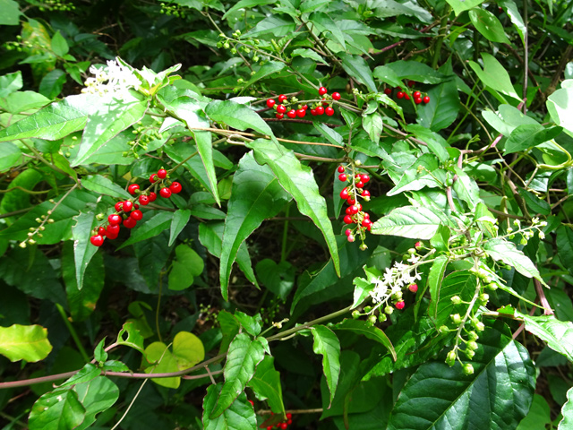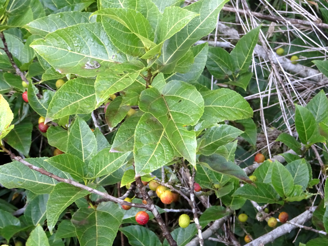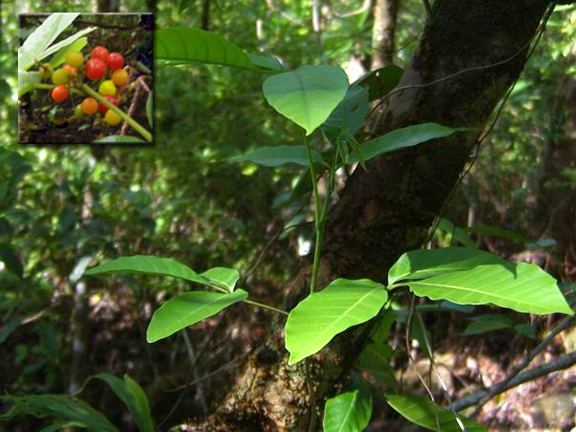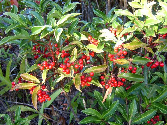 Arbuste de la forêt humide des bas, pouvant atteindre 7 m. Les feuilles juvéniles diffèrent des adultes. Petites fleurs blanches à l'aisselle des feuilles. On le reconnaît aisément à ses fruits qui poussent en bout de branches et ressemblent à des grappes de piments rouges.