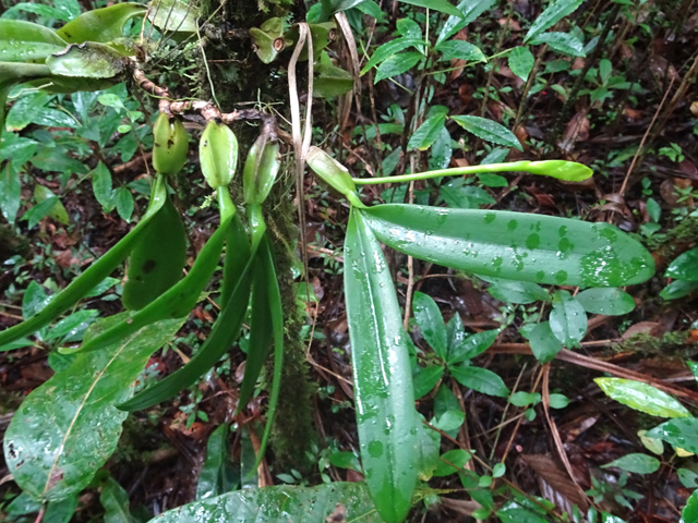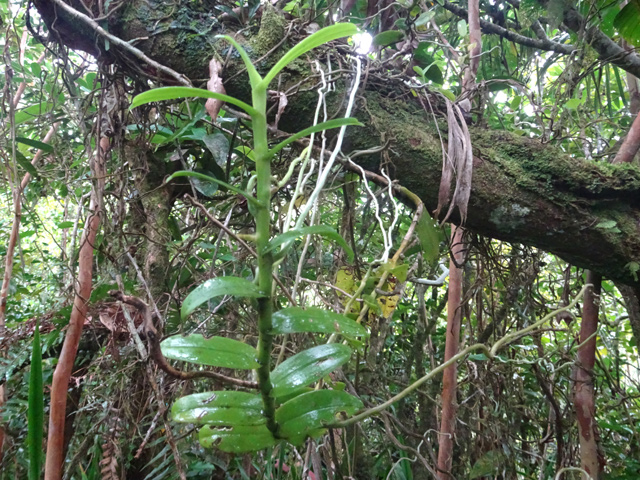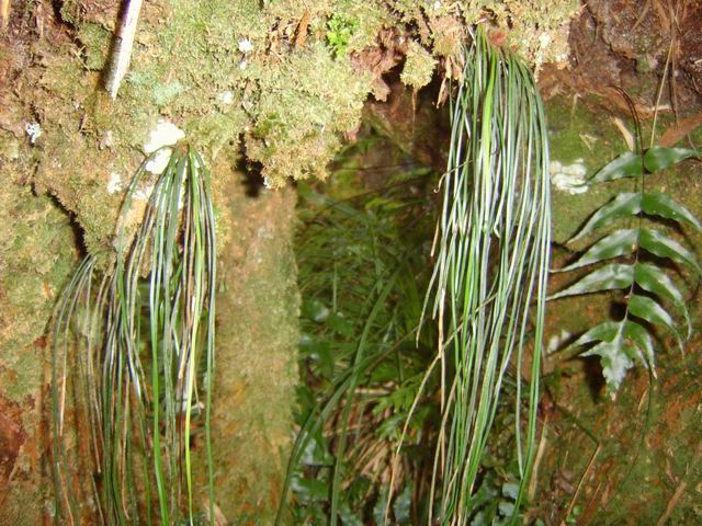 Cette fougère épiphyte se rencontre souvent en forêt humide, sous les troncs moussus des arbres penchés. Les frondes pendantes et plates sont collées les une aux autres. Diffère par la forme des pennes de Vittaria isoetifolia Pteridacées.