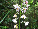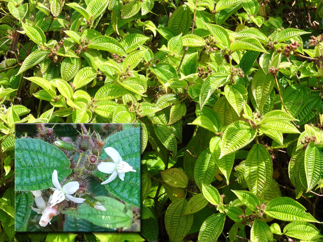 Arbuste de 6 m vivant en sous-bois humides de moyenne altitude ; endémique de La Réunion et Maurice. Feuilles juvéniles très décoratives. Feuilles adultes opposées avec nervure rougeâtre. Magnifiques petites fleurs blanches et roses à 4 étamines et un style rouge dépassant longuement. Fruits rouges striés de blanc à 4 noyaux.