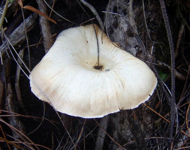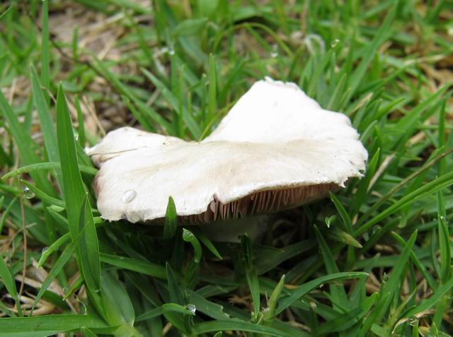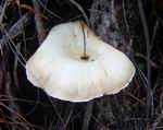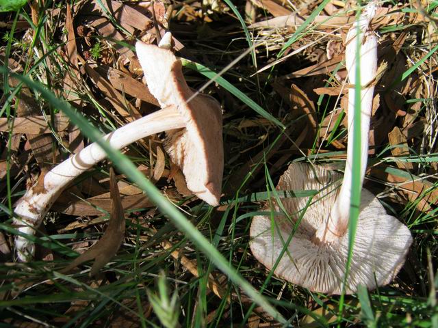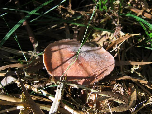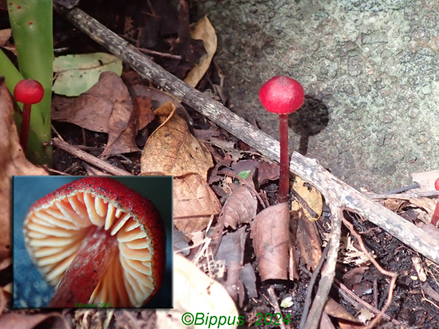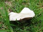 Magnifique champignon, très rare à la Réunion, disposant d'un pied blanc entouré d'une espèce de filet orange qui grandit avec le champignon. Spécimen trouvé dans un champ de canne. Photo Gilbert Moyne.