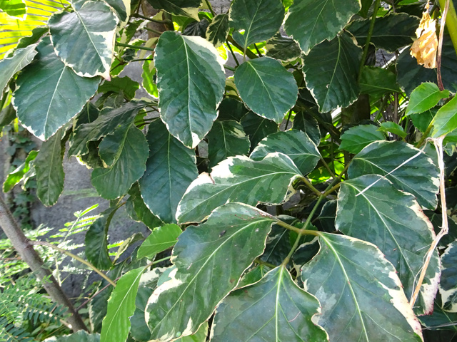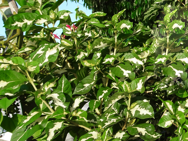 Plante endémique de Maurice et de La Réunion, qu'on rencontre hélas plus facilement dans un jardin qu'en forêt. Il peut atteindre 10 m. Les feuilles, longues et opposées, vertes et rouges, tachetées, sont différentes à l’état adulte. Les fleurs blanches, situées en fin de rameau, sont très odorantes et donnent des fruits en bouquet au bout des branches.