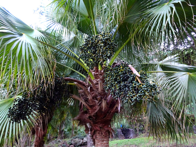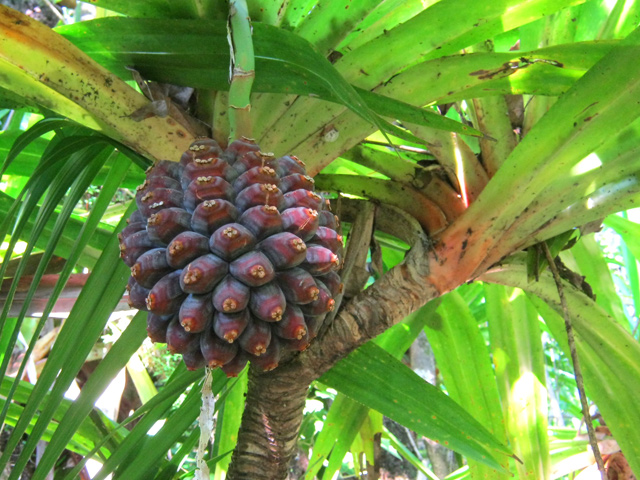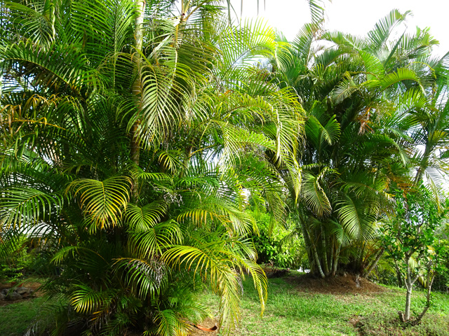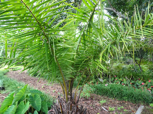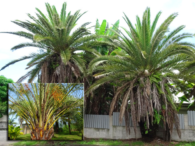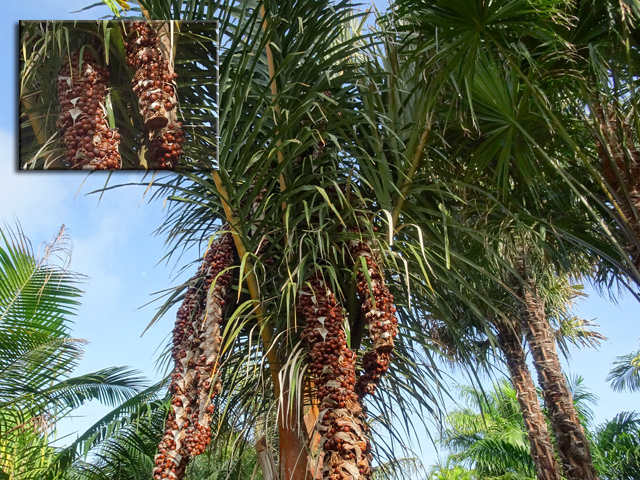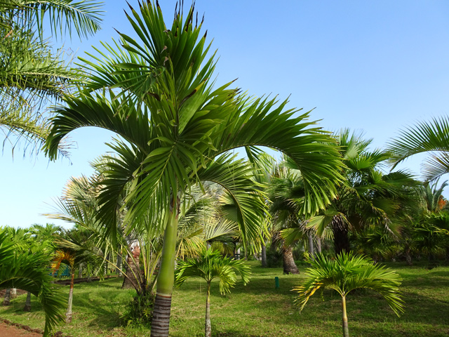 C'est le plus connu des palmiers de la Réunion. Importé de Madagascar, on le retrouve dans chaque jardin ou presque. Il présente la particularité de se multiplier à partir du pied. Ses fruits sont des énormes grappes de graines jaunes orangé.