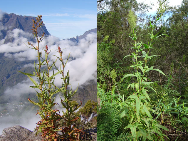Au retour de chaque randonnée je reviens avec des photos de plantes que j'ai remarquées. Hélas, je ne trouve que rarement le temps d'identifier les essences aperçues. Il y a plusieurs milliers de plantes répertoriées à La Réunion. En voici quelques centaines des plus faciles à étudier. La curiosité pousse parfois à donner un nom à une plante qu'on a remarquée pour sa taille, sa forme ou sa couleur. Il est bon également de savoir si une plante est toxique, endémique ou envahissante.Les textes ci-dessous feront ressortir en bleu les titres des plantes endémiques de La Réunion, de Maurice ou des Mascareignes afin de les repérer plus rapidement et en vert les plantes indigènes. Celles classées parmi les plus envahissantes seront en rouge. Enfin, si c'est le cas, un mot en violet permettra d'identifier une plante potentiellement dangereuse à toucher ou à consommer.