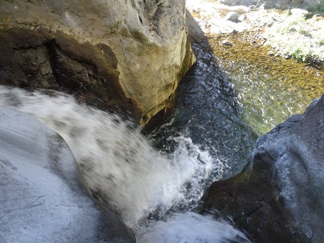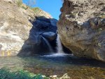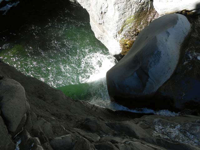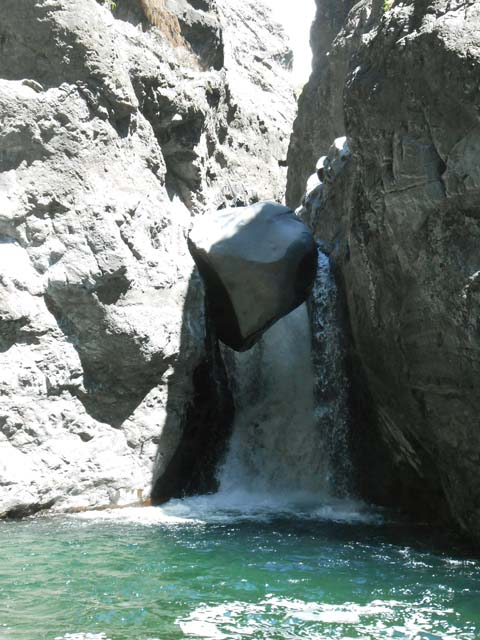 Très originale car surmontée d'un rocher tombé de la falaise qui s'use lentement en fonction des crues. Il semble instable mais pourtant tient bon et mettra sans doute des décennies avant de chuter dans le bassin.