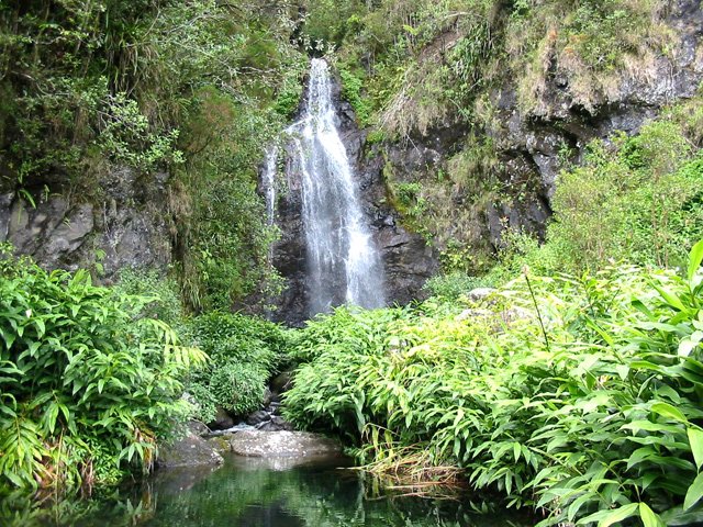 A partir de Hell-Bourg, après le RSMA et la route de Bellevue, prendre à gauche la route puis le sentier qui monte fortement en direction des Trois Cascades. Heureusement la distance est courte.