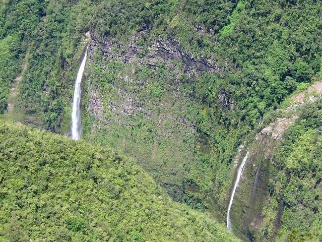 Difficile d'approcher ces hautes chutes alimentées par la Ravine du Paradis et de la Ravine Blanche ou leurs affluents, visibles lors de la descente vers le Morne Saint-François.
