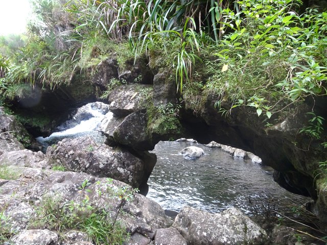 Superbe arche dans un écran sauvage de verdure qui surplombe un bassin d'eau sombre. La baignade y est très dangereuse et réservée aux canyonistes. La plus grande arche de toutes celles présentées sur cette page. Son intérêt provient en plus qu'elle est double. On dirait que seul un galet soutient le pilier central.
