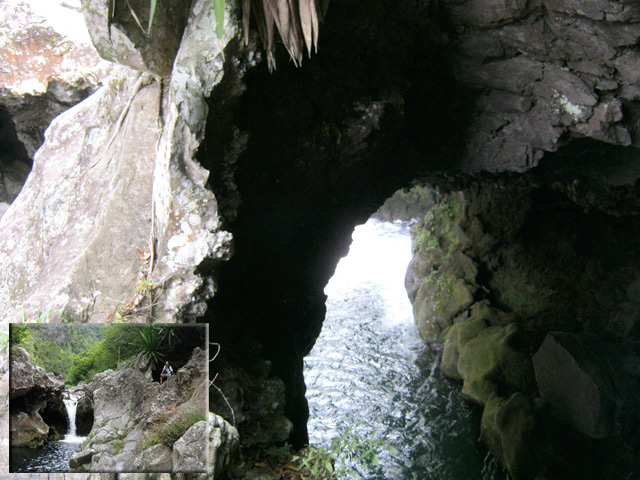Tout est beau dans le rayon de 30 mètres autour de cette cascade sur le Bras de Sainte-Suzanne (voir la page des cascades). La cascade, les grottes qui entourent le bassin d'eaux tumultueuses et cette arche par laquelle on accède à l'aide d'une échelle.