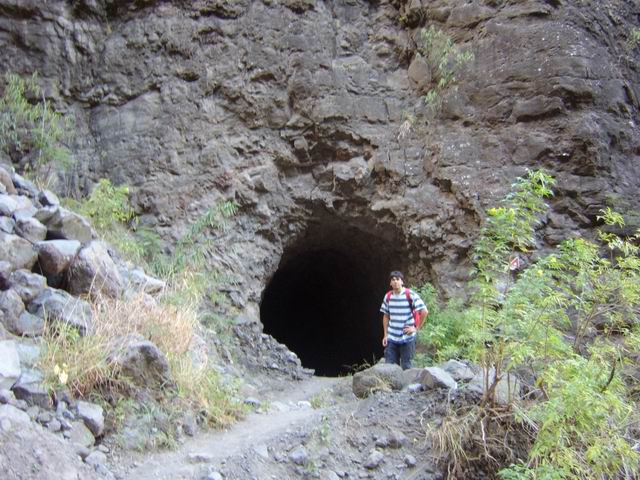 Tunnel de contournement du barrage situé sur la Rivière des Galets, court, sombre et légèrement coudé.