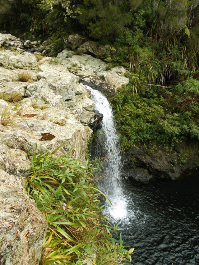 Petite cascade se jetant dans un très grand bassin aux eaux sombres. Attention à l'approche du bassin par temps humide.
