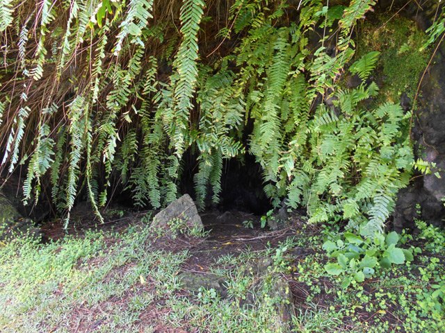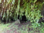 Un trou discret dans la falaise, en partie recouvert de longues fougères. Comme on ne voit pas le fond, il est plus prudent de le regarder plutôt que de chercher à l'explorer.