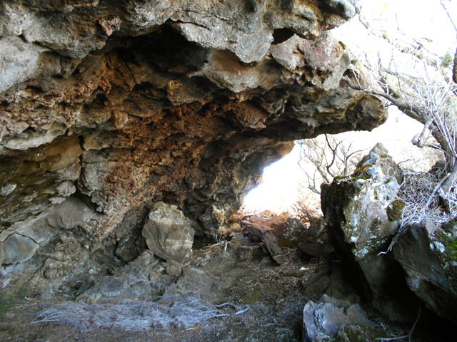 La grotte ne se voit pas immédiatement puisqu'elle tourne le dos au marcheur. Il faut contourner le bloc pour trouver un passage dans les branches et se retrouver sous la voûte. Les branchages encore au sol indiquent que cette grotte peut servir de bivouac ou de lieu de repos en cas de pluie ou de forte chaleur.