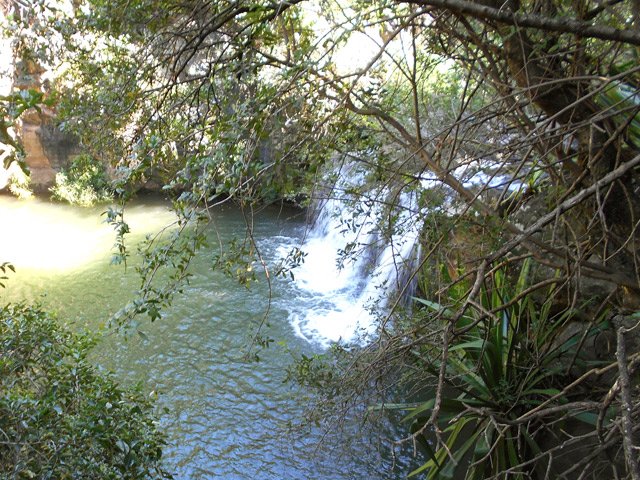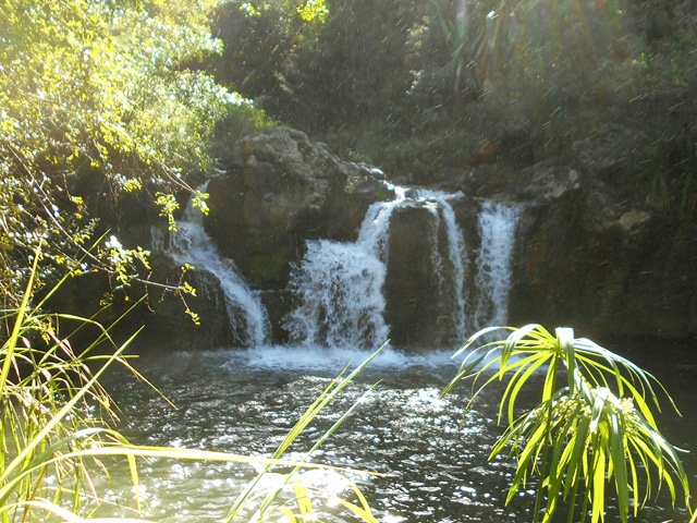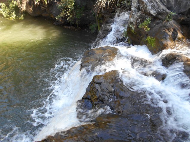 Très belle petite chute qui tombe en plusieurs cascades dans un cadre verdoyant de papyrus et sauvage avec des roches verticales autour du bassin.