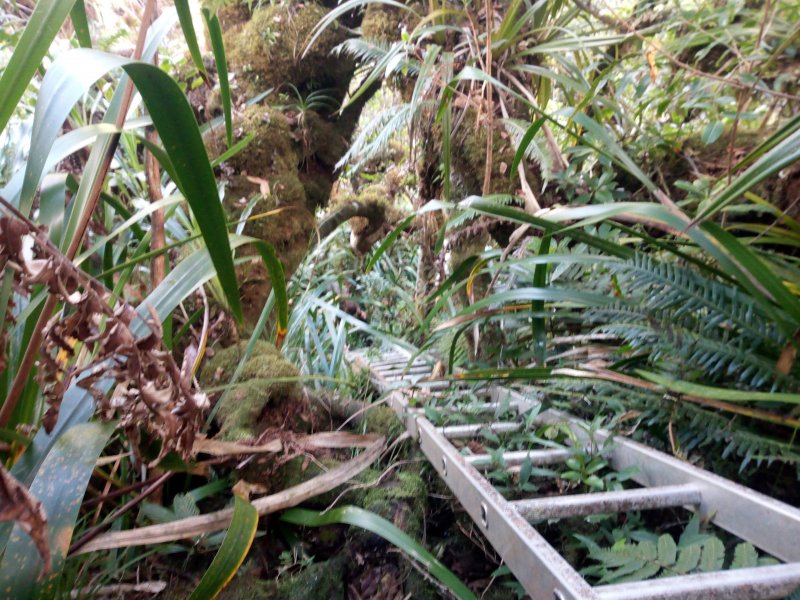 La partie suivante jusqu'à la première échelle est selon nous la plus paumatoire. Il y a plusieurs chemins piétinés qui partent dans de mauvaises directions, cependant le sentier se retrouve grâce aux coups de machettes et au marquage fluo orange( plus discret et rare) qui facilitent la raide ascension. Une fois arrivé aux échelles, l'orientation est selon nous plus simple.