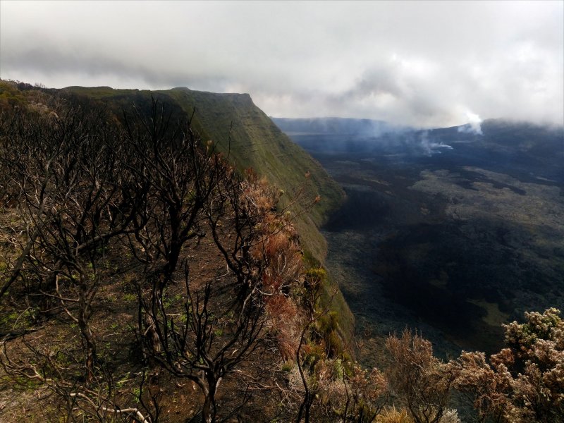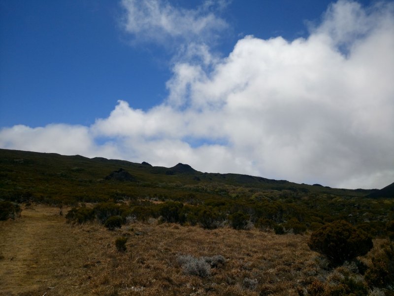 Une chouette montée par Jacques Payet (La strate forestière entre piton Lardé et la transition vers le paysage éricoïde est superbement variée, amateur d'Orchidées épiphtye, saxicole youhouh), encore quelques pas, voilà la caldeira et le sommet du piton de la fournaise se cache derrière un banc de nuage, ce n'est qu'un peu plus que je pouvais l'observer dans son entier, magique avec la lumière à cet instant!!!