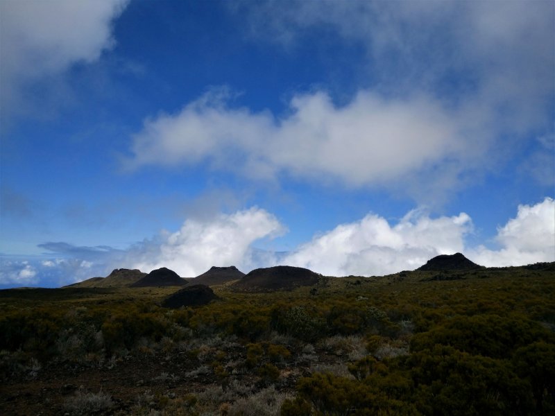 Le temps d'un tie pause snack et quelques photos zouh j'entame la descente roulante et ai été tellement émerveillé par le spectacle, l'endroit, oublié de checké la trace sur la montre, j'ai emprunté un bon morceaux de la variante (Pic 4 -__-) et je me retrouve parallèle au sentier de la boucle, à ce moment là je vois au loin les Puys hihi et les photos du site me reviennent à l'esprit (Mais, on est sensé passer entre ces petits monts ahah) la petite flèche du tracé-gps m'a aidé à couper, avec la plus grande précaution de ce ptit bout de "hors sentier" involontaire, à travers les branles et blocs éparses de basalte et >(Pic 5) me voici pas loin des Puys (Eh bien ils sont assez hauts pour certains, étonnantes structures) je ne traîne pas trop, la portion dans le bush, appréciable, m'a fait perdre une bonne heure et je descends en courant la très technique portion graton GRR2 (Attention chevilles, rotules et guibolles...)