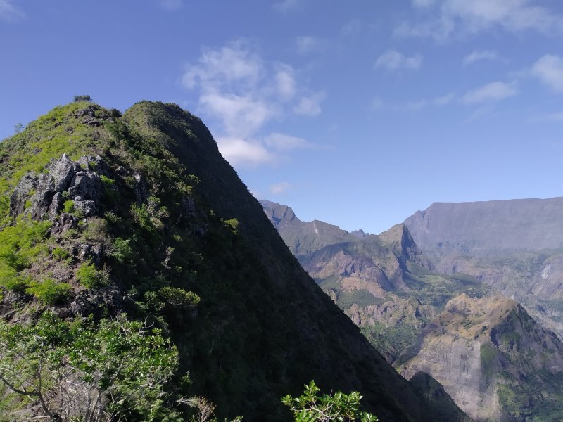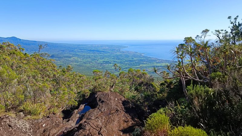 On tente de marquer la trace en cassant régulièrement les tiges. Heureusement les endroits envahis par la vigne marronne ont été dégagés par des coups de sabre. On est rarement à quatre pattes. Quelques endroits de longoses ont aussi été dégagés. Une fois qu'on se trouve sur la piste du Tévelave, il est possible d'accélérer l'allure. Les sentiers pour redescendre sur les Makes sont bien dégagés et ne posent aucun souci.