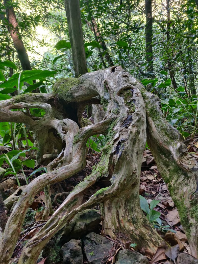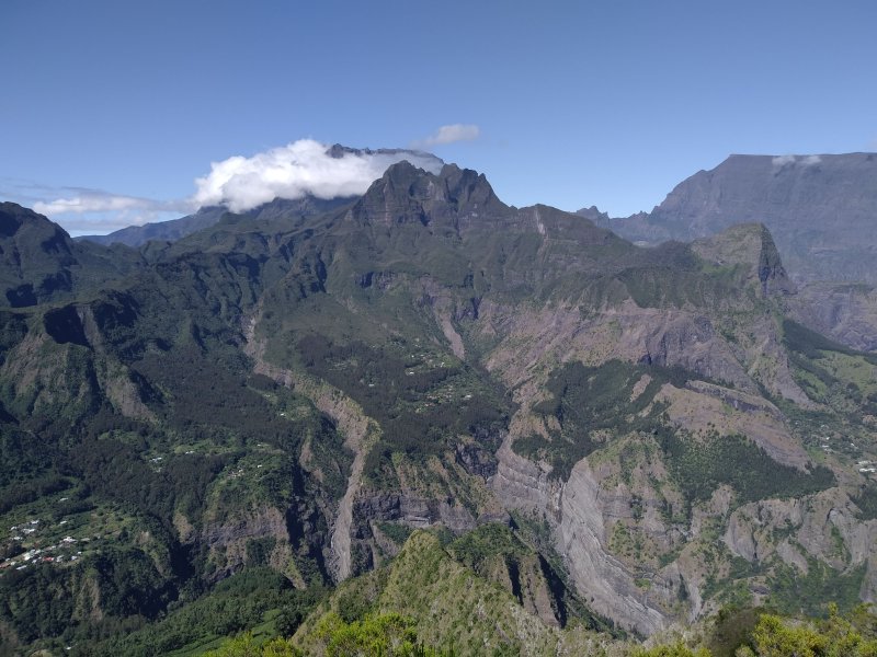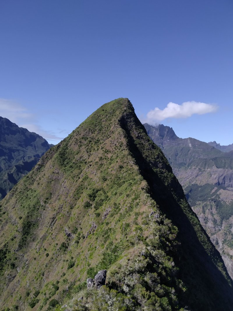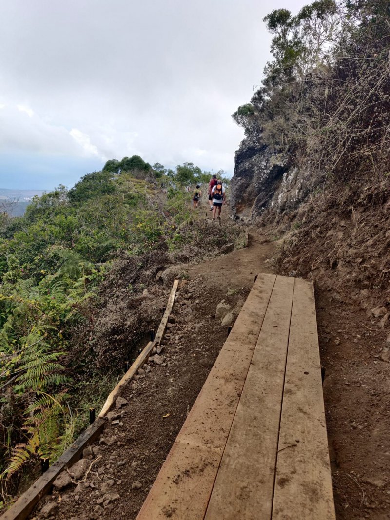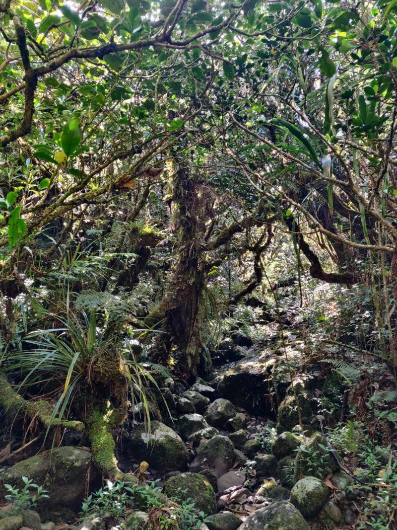 Nous en avons profité pour terminer l'opération Clean up de l'année dernière. De nombreux nouveaux déchets en un an sur ce sentier de chasseurs. Nous n'avons pas pu emporter une bouteille de vin en verre et une bombonne vide d'eau de 5L accrochée en haut d'un arbre, je ne sais pas à quoi ça peut bien servir. Nous avons tenté de donner quelques coups de sabre ci et là. La partie avec les fougères est bien encombrée. Arrivé sur le Sentier des Lataniers, j'ai eu un doute d'être sur le bon sentier, tellement le sentier était couvert de végétations ! De nombreux éboulements, toujours vérifier où l'on pose les pieds en écartant la végétation. De nombreux troncs d'arbres en travers du sentier avant d'arriver sur Grand Coin, du coup, la forêt est bien clairsemée à cet endroit.