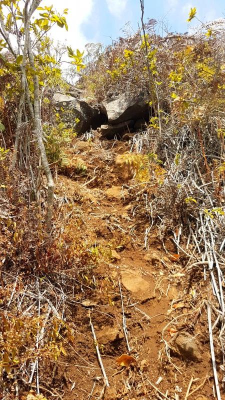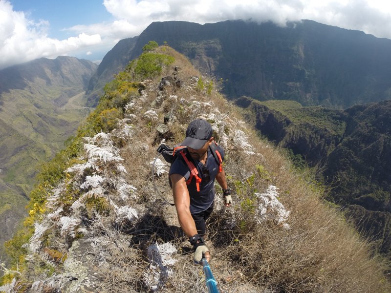 En synthèse : niveau sportif requis car ça grimpe sec et à un bon nombre de moments il faut mettre les mains voir littéralement escalader ! Il faut vraiment être attentif tout le temps car on perd vite la trace du sentier qui est à peine taillé à coup de sabre, surtout au début de la montée et dans les sous bois traversés car une fois sur la crête difficile de se tromper avec le vide de chaque coté !! Attention au début car si on suit le tout début du sentier on arrive à une porte fermée (plantation des habitants d'en bas je pense), là il faut chercher une trace sur la gauche qui retrouvera la piste pour monter. Coté équipement il faut absolument dans manches longues (bras et jambes), malgré la chaleur c'est indispensable si on ne veut pas ressortir les bras/jambres en feu à cause des égratignures des orties, chocka, fougères... protection solaire également, de l'eau !!! Ne pas trop s'équiper non plus car on est pas mal au niveau du sol à s’accroupir ou escalader et un gros sac s'accroche facilement et devient très vite gênant... A réaliser plutôt en saison sèche car avec la pente cela peut très vite glisser sans pardonner. Attention aussi aux appuis car parfois ce n'est que de la terre qui tombe si on marche dessus et parfois les pierres à escalader ne sont pas toujours stables. Enfin ceux qui ont le vertige s'abstenir !