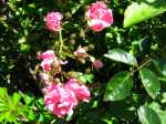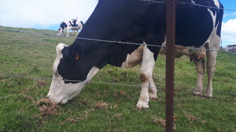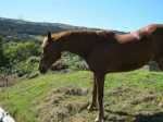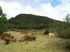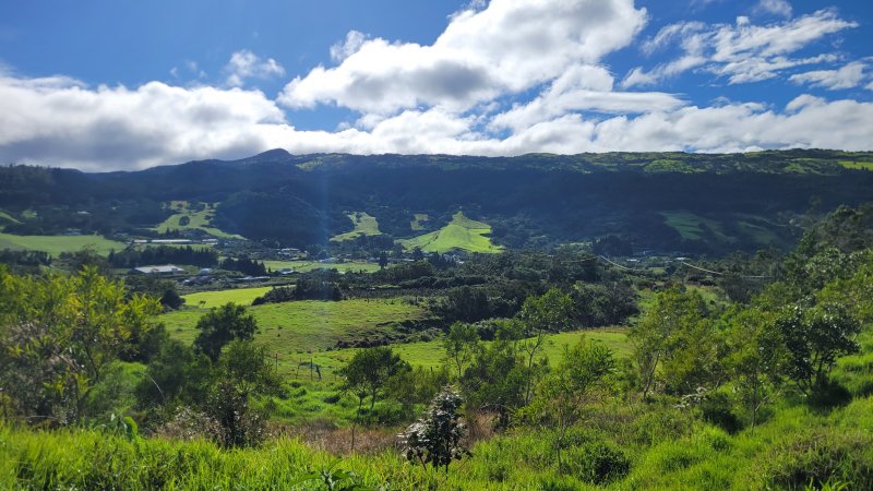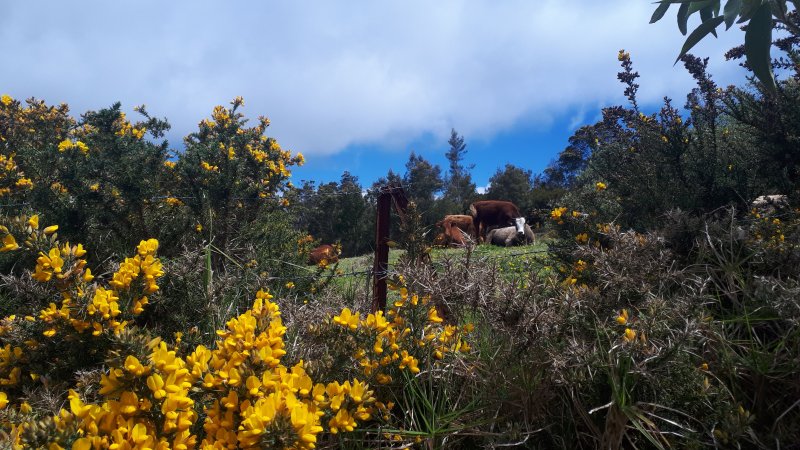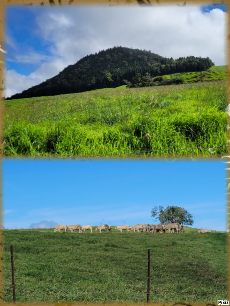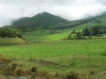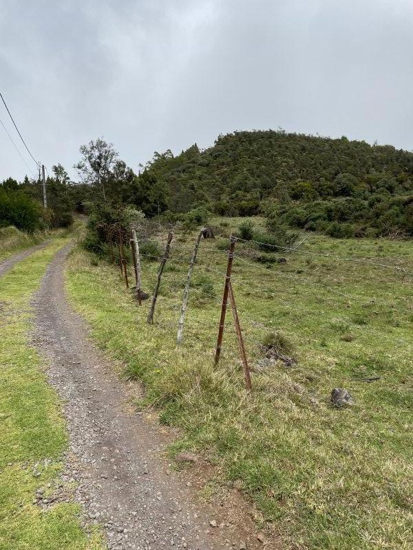 La deuxième solution consiste à ne pas prendre la dernière piste et poursuivre un peu vers le bas par une descente toute aussi vertigineuse que la première pour rejoindre l'Impasse du Piton Dugain et le début du sentier qui longe les canalisations venant du réservoir. Une fois sur l'impasse, marcher vers la ferme à travers de nouvelles prairies (Photo 19). Au croisement, prendre à gauche en direction de la Grande Ferme. Au croisement suivant, prendre également à gauche et poursuivre vers le volcan dans les prairies où paissent des vaches ou des chevaux qui n'hésitent pas à s'approcher pour voir passer des randonneurs (Photo 21). La fin de la boucle s'effectue totalement à plat en cherchant les roses dans les fossés où elles poussent nombreuses dans cette région fraîche (Photo 22). Les sportifs, une fois arrivés à l'Impasse du Piton Dugain, ne résisteront pas au plaisir de rebrousser chemin et d'effectuer le parcours inverse, penchés vers l'avant à guetter l'arrivée de l'oratoire blanc au sommet. Attention au cœur ou au souffle mais on évite ainsi la route.