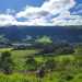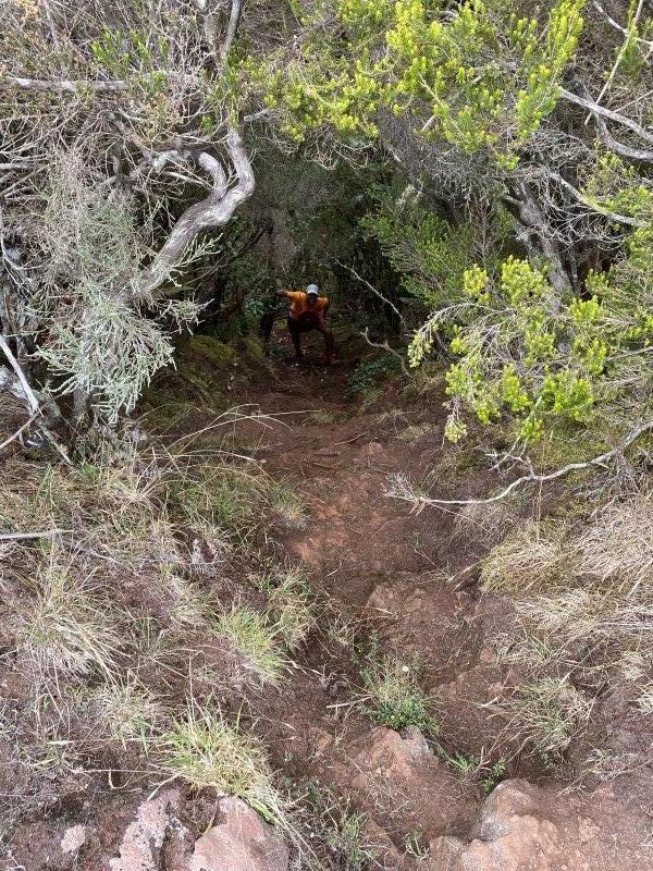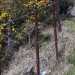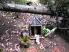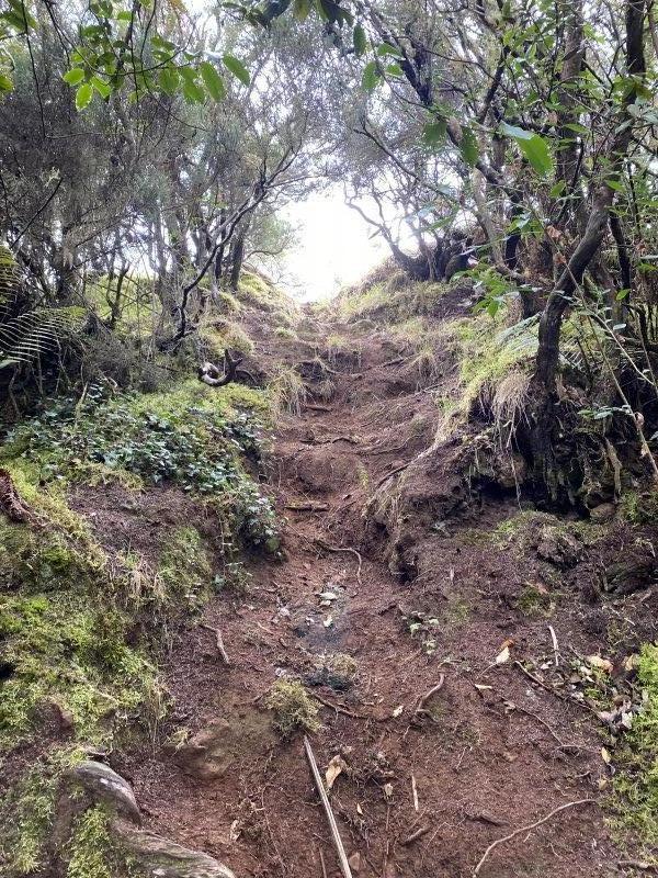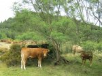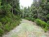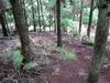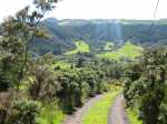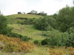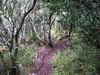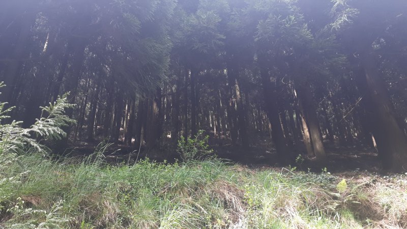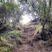 Deux solutions possibles à partir de l'oratoire : revenir sur ses pas vers le réservoir repéré en début de piste ou bien dégoter dans les branles verts proches de l'autel le petit sentier qui plonge dans sa trouée (Photo 9). Le mot plongée s'applique très bien à ce départ dans les branles verts et les fougères sur un sol glissant, certainement dangereux par temps de pluie. On a vite fait de voir, en s'accrochant aux branches qu'il ne comportera pas de lacets pour se reposer. Heureusement il est court car on sait bien que le piton ne dépasse que d'une centaine de mètres au-dessus des prairies. Il traverse branles et bois de couleurs (Photo 10) avant d'effectuer quelques lacets dans la forêt de cryptomerias (Photo 11). La descente est sérieuse et le sentier bien marqué. En arrivant à un minuscule oratoire également dédié à la Vierge, on comprend pourquoi il semblait être régulièrement pratiqué (Photo 12). Le sentier surgit sur une piste herbeuse au milieu des vieux cryptomerias (Photo 13).