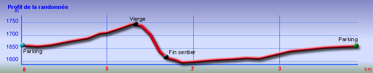 Cette randonnée facile, proche de Bourg Murat, est intégrée pour une partie dans le circuit agréable qui effectue le tour de Bourg Murat. Elle sera beaucoup plus sportive effectuée dans l'autre sens. Le profil ci-dessous, lu à l'envers, se passe de commentaire. La photo 12 présente une Vierge qui se situe dans la montée et qui peut représenter, aux yeux de celui qui l'a installée ici, l'occasion d'effectuer régulièrement un véritable chemin de croix, isolé et connu de personne. C'est certainement une station avant l'arrivée à la Vierge pour ceux qui viennent de Bourg-Murat et ne veulent pas marcher jusqu'au point de départ proposé ci-dessous. Peu d'intérêt pour cette boucle sinon celui d'escalader un des innombrables petits promontoires crachés par le volcan durant des millénaires, érodés et couverts de végétation mais entourés de belles prairies. On utilise la route pour en faire totalement le tour et l'observer sous toutes ses coutures. L'exploitation des grands cryptomerias a vite fait d'ôter du cachet à ce premier piton rencontré à Bourg Murat en se dirigeant vers la Plaine des Sables.