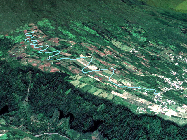 Il est vrai qu'un randonneur préfère les sentiers à la route pour pratiquer son loisir préféré. Mais, lorsque la route est étroite, un peu éloignée de la civilisation, bordée de fleurs et de champs ou présente de beaux panoramas sur la mer ou la montagne on peut pour trois heures faire une petite exception. Cette route monte en quelques lacets sur 5 kilomètres, régulièrement, avant de redescendre sur la même distance. La pente est faible et la circulation presque inexistante. On croise souvent des joggeurs ou marcheurs qui ont déjà repéré le calme de l'itinéraire. Cette sortie peut être mise à profit lors d'une randonnée marmaille pour un petit cours de botanique. En effet, toutes les pestes végétales sont hélas présentes en bordure de route mais ce sont surtout les fleurs qu'on remarque dès l'arrivée. On en trouve une multitude qu'on a peu l'habitude de rencontrer, à condition bien sûr, d'effectuer le circuit en fin d'année, au moment des meilleures floraisons. Les panoramas ne sont pas exceptionnels mais on a de belles vues sur l'Océan, les villes littorales comme Saint-Joseph ou Vincendo et surtout la vallée de la Rivière Langevin qu'on peut admirer chaque fois qu'un champ se présente et ouvre l'horizon.