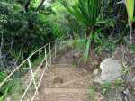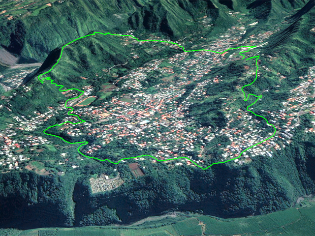 La randonnée peut débuter n'importe où sur le circuit expliqué ci-dessous qui, lui, commence à la passerelle marquant le début de la très fréquentée descente vers le Pont de la Liane. Partir vers le Cimetière puis bifurquer avant de le rejoindre entre les murets qui marquent le début du parcours vers le Bras Long. On se retrouve sur le sentier du Bassin Sassa qu'on peut visiter très rapidement en quittant le parcours pour atteindre le lit du ruisseau (Photo 2). Le bassin est très modeste ainsi que la petite cascade qui l'alimente et il est presque impossible de s'y baigner car l'accès est dangereux. La remontée vers la ville s'effectue en longeant le Bras long, en marchant souvent dans le lit sur des galets marqués par endroits de grandes flèches blanches (Photo 3). Rejoindre ainsi une touffe de bananiers et remonter vers les premières habitations sur un sentier pentu mais court comportant quelques marches un peu raides (Photo 4). Suivre les ruelles qui mènent à la rue principale en partant sur la gauche. Ne pas manquer le cacaoyer à l'angle des rues Julius Hoareau et Fortuné Hoareau car on a peu souvent l'occasion de rencontrer cet arbre. Bifurquer à gauche et marcher en direction du stade. Après cette portion de bitume de la D26, emprunter le Chemin Grand Fond Extérieur, dépasser le premier croisement rencontré à gauche puis entamer la grimpette du sentier de bord, assez facile à repérer (Photo 6). Il rejoint les terrains de tennis et monte en lacets serrés sous quelques bois de couleurs, jamblons, faux poivriers, fougères, manguiers et filaos. On s'élève assez rapidement en profitant de quelques panoramas dans les trouées de la végétation (Photo 7). Des panneaux pédagogiques sont régulièrement installés pour apprendre à dessiner la nature (Photo 8). Certaines portions sont très rocheuses ou encombrées de racines (Photo 9). Cette montée se termine au réservoir le long de la route (Photo 10). Prendre à droite puis marcher en direction du Nord vers Grand Fond Extérieur. Profiter des panoramas grandioses sur la chaîne du Dimitile d'un côté (Photo 11), de la ville à nos pieds (Photo 12), sur la vallée du Bras de Cilaos et la route de l'autre (Photo 13). On trouve un autre réservoir dans la montée à la fin de la route mais une large piste débute à gauche avant le réservoir. La montée rectiligne se poursuit jusqu'aux filaos et aux bambous (Photo 14) avant de redescendre sous les manguiers vers les maisons de Grand Fond Extérieur (Photo 15). Laisser à gauche le Sentier Bayonne et poursuivre par la Rue de Grand Fond extérieur pour pénétrer un peu en ville. Depuis la fermeture du sentier de l'Endormi et du sentier Cheval, il est obligatoire de poursuivre par les rues pour regagner la Rue Bras Long. Ce n'est pas la zone de la ville où l'on rencontre les plus jolies cases mais il y a toujours des curiosités à observer comme les cultures en bordure de rue, les jardins, les jaquiers croulant sous les fruits (Photo 16) ou un pied d'ylang-ylang très odorant à la saison des fleurs (Photo 17). Comme toujours dans le village, on a des des vues sur le Dimitile à l'horizon (Photo 18). Rejoindre la Rue Bras Long noyée dans la verdure ou les bordures fleuries (Photo 19). Partir légèrement sur la gauche pour retrouver le Chemin du Château d'Eau qui commence par une volée de marches en direction de la Rue Laurent Lauret (Photo 20). Pas de difficulté pour récupérer dans la descente de cette rue le sentier Rosélie qui monte rapidement vers le Sentier du Zèbre à partir d'une ferme d'élevage. La grimpette est courte mais sérieuse (Photo 21). Quelques lacets ombragés sont recouverts de grosses pierres et de racines et le cheminement est un des plus lents de la sortie. Le dépliant donne quelques mots sur Monsieur Rosélie qui l'employait pour regagner ses champs de géranium vers le Dimitile. Quelques portions comportent des rondins, plus aisés que les roches (Photo 22). Le sentier du Zèbre n'aura pas le temps de fatiguer car on parvient en deux minutes à un banc de repos pour observer le panorama près d'une touffe de bambous d'où il est possible d'étudier tout le chemin parcouru (Photo 23). Tourner à droite après les bambous, ne pas poursuivre vers le château d'eau et descendre la totalité du chemin bétonné qui se termine à la route principale vers la Ravine des Citrons (Photo 24). Prendre à gauche la Rue Jean Lauret puis, plus loin la Rue Maurice Berrichon et marcher jusqu'à de grosses touffes de bambous à l'approche des lacets de la route. Retrouver le départ du sentier qui descend fortement vers le début du rempart du Bras de La Plaine (Photo 25). On parvient au sentier du Pont de la Liane un peu plus bas après avoir terminé la descente presque rectiligne (Photo 26). La boucle est terminée mais il est possible de se promener à loisir dans le village pour découvrir les belles cases qui attirent chaque semaine des dizaines de touristes (Photo 27) ou pour admirer les jardins verdoyants ou fleuris et pourquoi pas l'architecture particulière des cases créoles (Photo 28).