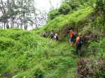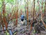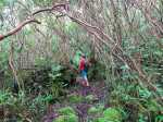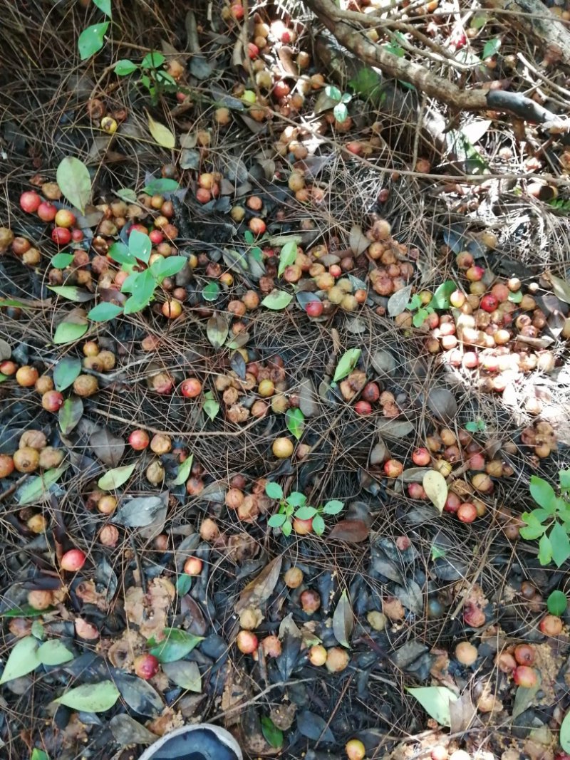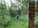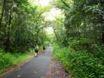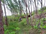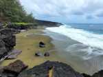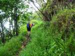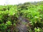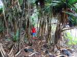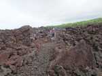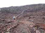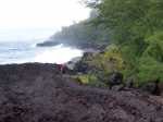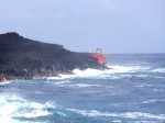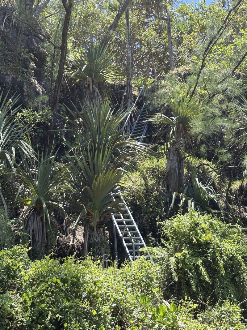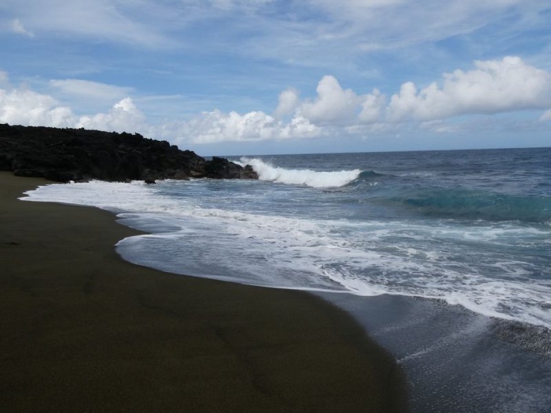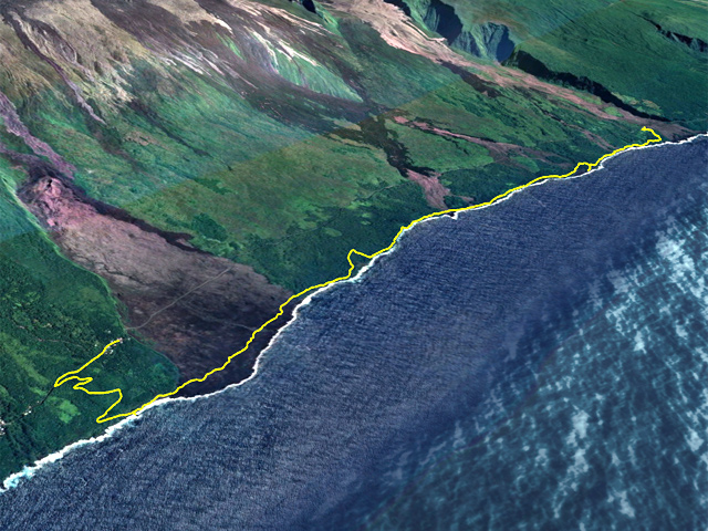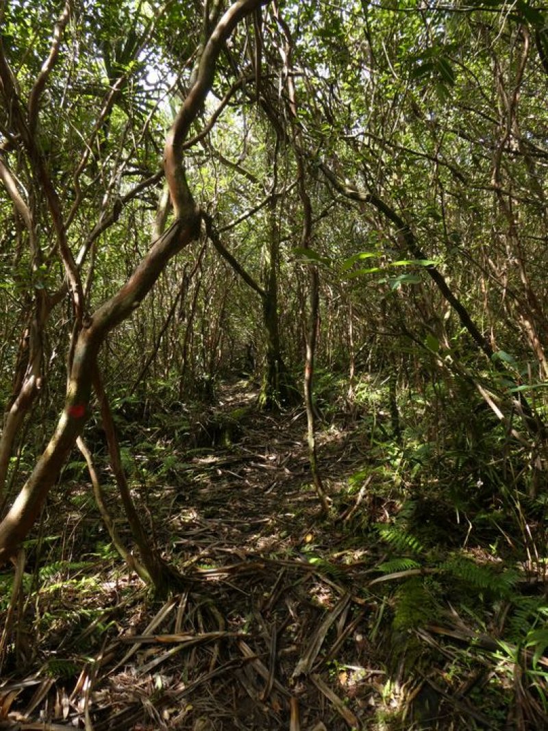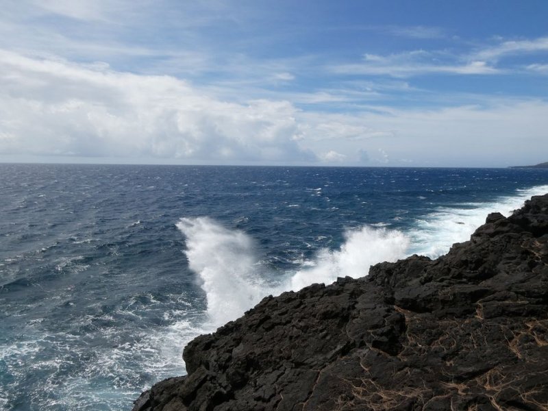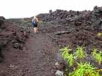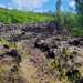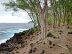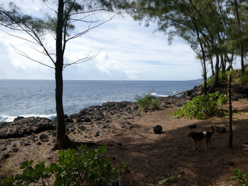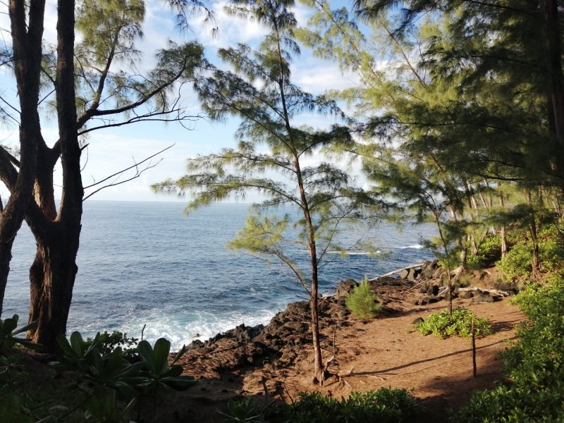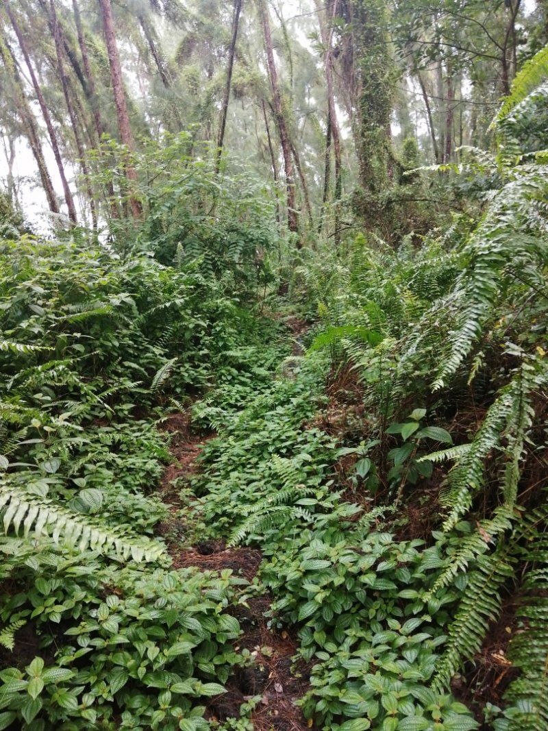 La randonnée débute ici à l'ancien emplacement de la Vierge au Parasol. Cette statue de la Vierge munie d'un grand parasol, vandalisée et déplacée maintes fois, a quitté depuis longtemps son piédestal du Grand Brûlé mais le lieu demeure ainsi qu'un arrêt de bus jamais supprimé. C'est la solution choisie pour refaire cette fiche afin d'éviter un aller-retour par le sentier et ne pas emprunter la trop longue Route des Laves. Près d'un oratoire rouge dédié à Saint-Expedit débute la piste forestière du Quai de la Vierge qui se dirige vers la mer (Photo 1). Elle ondule entre filaos et bois de chapelets en pente douce sur un terrain de gratons tassés bordé d'orchidées bambou (Photo 2). On arrive rapidement au départ du Sentier des Laves. Lorsque l'on entend les vagues battre les falaises basaltiques, ne pas hésiter à s'en approcher par le sentier escarpé qui file droit pour apprécier le côté sauvage de l'endroit prisé par les pêcheurs. Revenir au départ du Sentier des Laves qui débute dans les fougères. La trace est discrète mais visible. Le sol est immédiatement recouvert de nombreuses racines, puis, plus loin de quelques roches qu'il faut éviter (Photo 3). La trace, balisée de bleu, est facile à suivre même lorsque les invasives tentent de reprendre leur place (Photo 4). Ne pas manquer la petite grotte sur la droite avant d'effectuer la première descente en direction de la mer bordée de beaux filaos (Photo 5). On aura ainsi de nombreuses possibilités de s'approcher du bord proche ou accessible par des sentes de pêcheurs. Les premiers goyaviers font leur apparition mais ne gênent pas la progression malgré leur nombre et leur taille (Photo 6). Moins de trente minutes après le départ, on arrive à la coulée de 2002. Vingt ans après son écoulement vers la mer, elle se couvre lentement de lichens et se traverse sur un sentier tracé dans les laves (Photo 7). La végétation change encore pour être remplacée par de l'herbe sous les filaos (Photo 8). Très vite, après avoir plongé sous le couvert de la végétation, le sentier s'approche de la Piste forestière du Quai Neuf. Avant de poursuivre, ne pas hésiter à se rendre sur cette longue surface basaltique créée en 2004 par une éruption assez importante. On peut facilement marcher là où se rassemblent les pêcheurs pour y admirer la mer démontée ou les baleines à la saison. Remonter vers la piste en délaissant une tombe ainsi qu'un bloc de béton et marcher 200 mètres avant de retrouver le sentier repartant sur la gauche (Photo 9). Après une courte descente, le sentier s'approche de la coulée de 2004, plus facilement reconnaissable à ses larges plaques de lave lisse (Photo 10). Cette coulée est criblée de tunnels de lave de plus en plus difficile à trouver à travers les filaos. Le panneau de départ prévoit une altitude de 83 m, la coulée à 31 m, alors que l'on a descendu moins de 4 m. En moins de 5 minutes on traverse la coulée qu'on retrouvera un peu plus loin après avoir franchi quelques sous-bois verdoyants (Photo 11). Le sentier n'est plus très large mais toujours aussi bien tracé dans les filaos et les fougères (Photo 12). La marche n'est jamais monotone puisque le terrain monte et descend constamment sur un sentier qui ondule pour éviter quelques reliefs du terrain. Il part à la rencontre d'une végétation très variée où circulent des centaines d'énormes achatinesEspèce d'escargot à la coquille allongée pouvant atteindre 15 cm pour 200 g qu'on bouscule facilement du pied. Il traverse aussi une importante étendue de manioc, de tabac marron (Photo 13) puis de pandanus (vacoas) lorsqu'il passe au plus près des vagues (Photo 14). On traverse bientôt une nouvelle coulée de 2002, la troisième depuis le rempart de Bois Blanc et la deuxième de cette randonnée. En 20 ans, les fougères remplacent les lichens et les filaos y sont déjà grands par endroits (Photo 15). Le terrain devient plus chaotique avec des ornières, des roches, des fissures à travers les goyaviers (Photo 16). On remarque même sur la droite du sentier, une entrée de tunnel de lave. Rien d'extraordinaire dans ce court boyau qui peut représenter une pause ludique à 2h30 du point de départ (Photo 17). Compter encore trente minutes de goyaviers, ornières et fissures ou filaos brûlés avant de s'approcher de la coulée de 2007 (Photo 18). Le sentier effectue même une longue incursion vers l'ouest pour arriver à la fin de la route forestière venant de la RN2. Il aura fallu attendre 15 ans pour pouvoir traverser ces laves qui ont mis longtemps à refroidir. Un sentier net et bordé de pierres de lave a été créé et atteint la nouvelle plage du Tremblet après une agréable marche offrant de superbes panoramas sur la totalité de la coulée (Photo 19). Ce sentier original serpente entre les aspérités du terrain (Photo 20). Les poteaux de l'ONF déconseillent de sortir de ce sentier mais il serait difficile d'y parvenir sans se blesser sur les blocs acérés empilés sur plusieurs mètres de hauteur (Photo 21). Des travaux de terrassement ont même été exécutés pour franchir les endroits les plus sensibles (Photo 22). Il faut compter près de 30 minutes pour parvenir à la nouvelle plage du Tremblet qu'on domine par de beaux points de vue (Photo 23). Le balisage bleu se poursuit le long de la falaise dominant la plage, là où coulent parfois d’éphémères cascades (Photo 24). Par forte houle, la plage recouverte d'olivine peut être dangereuse (Photo 25). On devine au loin la carcasse déchirée du Tresta Star qui semble avoir pris racine pour de longues années (Photo 26). On la distingue depuis le Quai de Sel servant de point de départ au sentier remontant le rempart en direction du Tremblet ou du sentier vers Saint-Philippe (Photo 27). La fin de cette sortie s'effectue en montée sur une route étroite, bordée de verdure (Photo 28). A la RN2, repartir à droite p