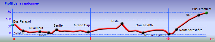 Se rendre au Tremblet et rouler jusqu'aux dernières habitations - Stationner avant le dernier virage puis emprunter le bus pour se rendre à l'arrêt "Vierge au Parasol" vers Bois Blanc (Il est même conseillé de prendre le Car Jaune de n'importe quelle ville de l'île) - Emprunter la Piste Forestière du Quai de la Vierge qui se dirige vers l'océan - Presque en fin de piste, repérer sur la droite le début du sentier - Le suivre sur 6 kilomètres pour rejoindre la coulée de 2007 - Traverser la coulée sur le magnifique sentier mis en place par l'ONF et rejoindre la nouvelle plage du Tremblet - Remonter jusqu'à la route forestière puis la RN2 - Prendre à droite et marcher sur la RN2 jusqu'à l'arrêt de bus du Tremblet, fin de la sortie.