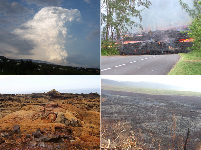 Photos : Nuage de fumée pris depuis la maison à Petite Île. Traversée de la RN2 par la lave. Lave solidifiée à la fin de l'éruption. La coulée vue depuis le dernier virage au Tremblet avant la réfection de la route.