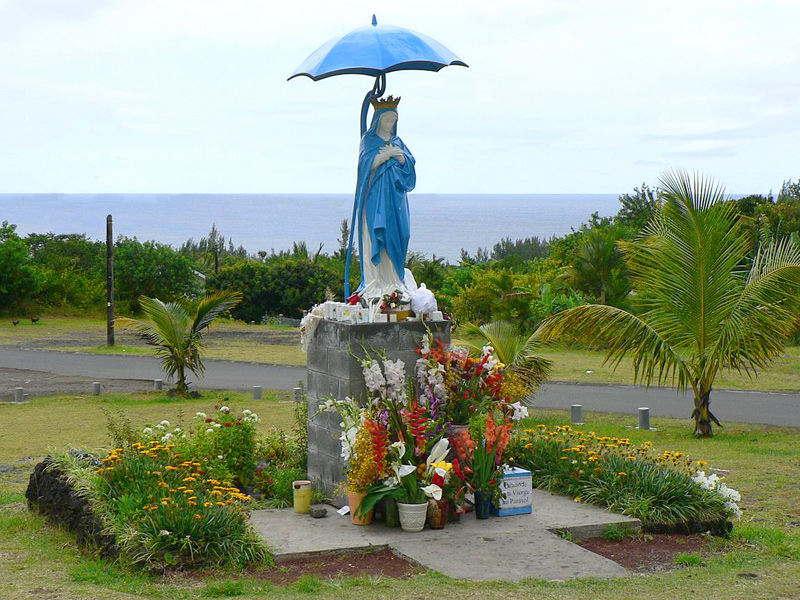 En 1897, nait la légende de la Vierge au parasol. La statue, installée à Bois Blanc pour protéger les plantations de vanille, est contournée par des coulées issues de la Fournaise. Le "miracle" dure dans les esprits jusqu'à 1961, date où elle est totalement recouverte par une nouvelle coulée. Une nouvelle vierge est érigée au pied du rempart de Bois Blanc. Menacée et même évacuée lors de nouveaux épisodes volcaniques, ce sont les vandales qui la chasseront définitivement du lieu en janvier 2014 après l'avoir décapitée et en avril 2015 lorsque sa nouvelle réplique est taguée de rouge. Elle est désormais gardée à Saint-Rose mais l'ancien emplacement, encore visité pour des prières, demeure à quelques mètres de l'arrêt de bus portant son nom et servant de point de départ à cette randonnée.