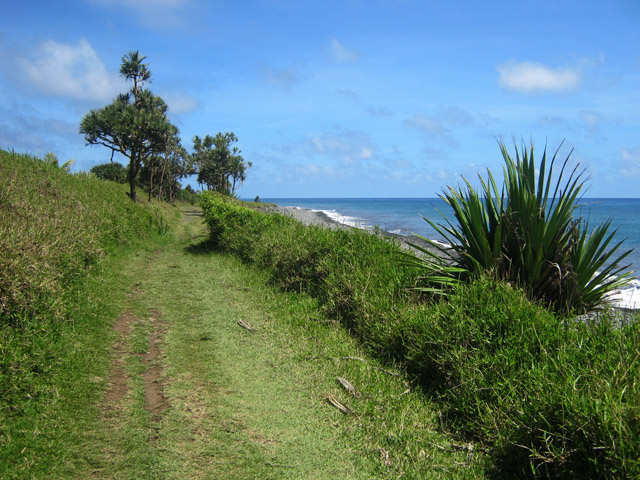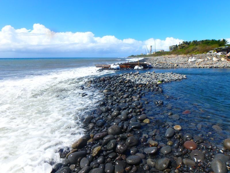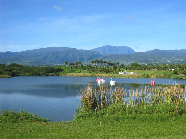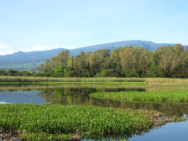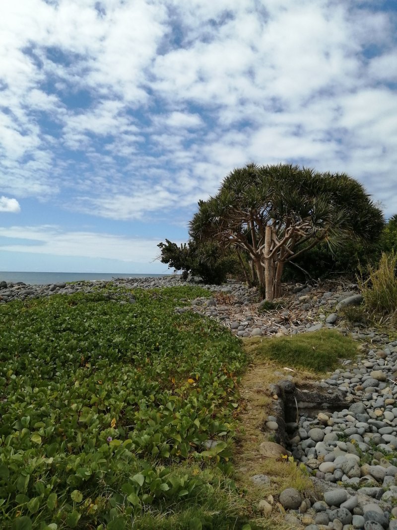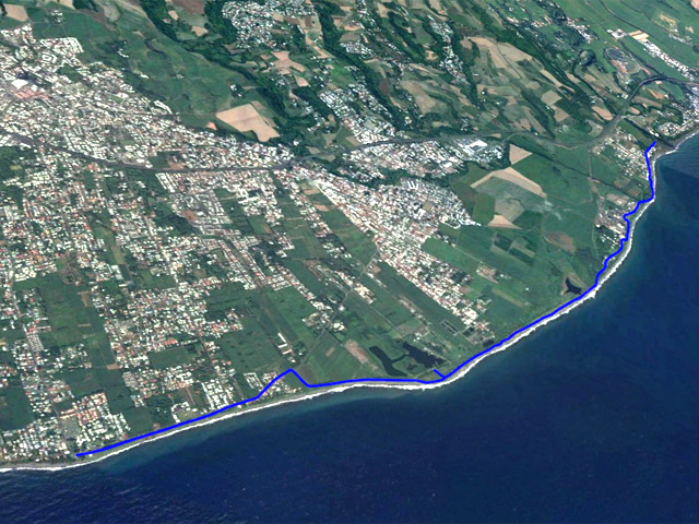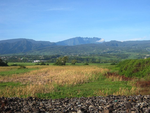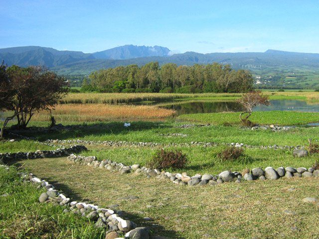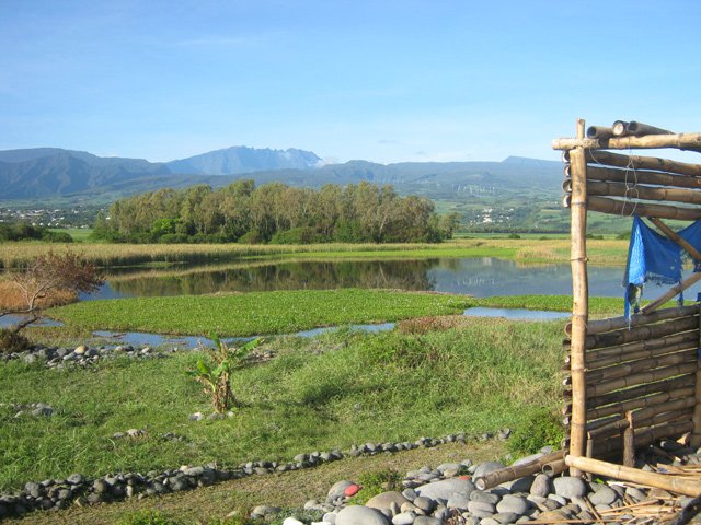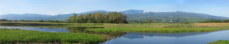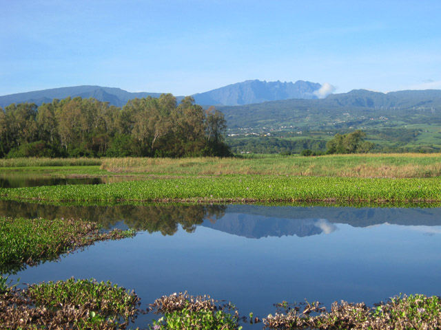 La randonnée débute à la Marine de Sainte-Suzanne, située sur la rive droite de la rivière. Se rapprocher de la déchèterie, non pour y glaner quelques odeurs mais pour profiter du beau point de vue sur les montagnes à partir des berges de la rivière (Photo 1). Il est possible de rejoindre les deux rives par la plage de galets si elle n'est pas trop creusée par les pêcheurs de bichiques et si on vient de Sainte-Marie par la plage (Photo 2). De l'autre côté de la rivière apparaissent quelques installations du parc de loisir du Bocage avec panoramas sur le Gros Morne (Photo 3). Longer la presque totalité de la Rue des Pêcheurs. Après cette route truffée de nids de poules aux alentours de l'école de la Marine et une traversée du village, gagner la plage de galets par une piste caillouteuse qui débute à gauche en face des dernières habitations. Rejoindre rapidement la plage de galets pour une courte traversée jusqu'au delta de la Grande Rivière Saint-Jean. Avec un estuaire en constants changements dus aux mouvements incessants de la mer et de la rivière, difficile de donner un itinéraire précis. Chercher donc le meilleur passage sachant qu'on sera obligé de franchir les pieds dans l'eau. Le débit est variable mais peut être fort. La hauteur d'eau ne dépasse pas les 60 cm, la largeur est très faible et le courant est lié à la force des vagues qui cherchent à envahir la rivière (Photo 4). C'est plus aisé à marée basse. Ce sera la seule occasion de se mouiller durant tout le trajet ; il est donc préférable de se déchausser pour éviter de faire pénétrer le sable dans les chaussures trempées. Une fois la traversée effectuée, on suit un peu la rivière qui ressemble parfois à un petit lac d'eau calme (Photo 5). On se retrouve plus loin face à un grand tas de terre qui marque le début de la déchèterie. Un sentier part vers la gauche et longe les deux usines (distillerie et sucrerie) pour se terminer à la route de Bois Rouge. Il est de plus en plus recouvert d'herbes ou de déchets et il est préférable de monter la butte et de traverser la zone de stockage de containers pour rejoindre une belle piste qui se termine également à la route de Bois Rouge. L'usine est assez longue mais le contournement, quel que soit le trajet emprunté, est rapide (Photo 6). Pas de pancarte d'interdiction de passer. Poursuivre à travers le hameau de Bois Rouge en passant devant le terrain de sport et en marchant jusqu'au petit rond-point en fin de route. Poursuivre sur une piste herbeuse, sous de grands eucalyptus, qui mène presque aux berges de l'étang (Photo 7). La région est une large plaine cultivée de canne à sucre comprenant le grand étang de Bois Rouge (Photo 8). L'endroit est charmant avec ces beaux paysages en direction du Gros Morne et des pitons qui l'entourent (Photo 9). Les jacinthes d'eau ont envahi une grande partie de l'étang (Photo 10). Après avoir profité des reflets du Gros Morne dans les eaux claires, on retrouve très vite une magnifique aire reboisée de petits arbustes et entretenus par l'association 3E (Environnement Est Ecologique ?). Quelques installations sommaires sont construites en bambou mais ne restent pas des années en raison des vents lors des épisodes cycloniques (Photo 12). Plus loin c'est une autre section entretenue par l'Association de Développement du Quartier des Mille Roches qui tond, peint et range les galets le long du chemin (Photo 14). Une piste herbeuse bordées de murets de galets ou de vacoas prolonge ces belles pistes (Photo 15). Un vrai plaisir de marcher ici jusqu'au Petit Etang de Bois Rouge (ou Cambuston, ou Colosse en fonction des gens que l'on rencontre !). On longe les installations de décantation de la station d'épuration sans en être gêné. Des passerelles au-dessus de l'eau couverte de jacinthes sont devenues trop dangereuses et sont désormais interdites au public (Photo 16). Espérons que les planchers seront refaits à neuf dans le cadre du réaménagement du parc du Colosse qui devrait prendre beaucoup de temps. Lorsque c'est possible, la promenade était ludique. Marcher ensuite en bord de mer sur une piste caillouteuse proche de la longue plage de galets (Photo 17). On peut même employer des petits sentiers qui traversent des zones herbeuses (Photo 18). La piste est agréable avec le talus sur la droite qui retient les eaux marécageuses du Petit Etang (Photo 19). A la fin du talus, partir effectuer un court écart vers les berges de l'étang (Photo 20). On rencontre très vite une large et plate piste, peu ombragée (Photo 21) qui se termine à la D47 après avoir longé un champ d'ananas mieux gardé que la prison de Domenjod par des dizaines de tôles ondulées en guise de clôture (Photo 22). Malgré le passage sur la route assez fréquentée, une halte au temple tamoul (Photo 25) ou à la cheminée en ruine permet de diversifier les paysages (Photo 24). L'arbre qui pousse en haut de la cheminée donne l'impression d'une fumée verte qui en sort, poussée par le vent ! Après une minuscule ravine, on trouve d'un simple coup d'œil la piste (Photo 26) qu'on suit sans aucune difficulté jusqu'à un restaurant puis une église en ruine (Photo 27) qui marque la fin du parcours. Ne pas manquer le minuscule cimetière marin dont une partie a été emportée par un cyclone ainsi que l'immense ficus au pied de l'église. Le retour s'effectue par le même itinéraire.