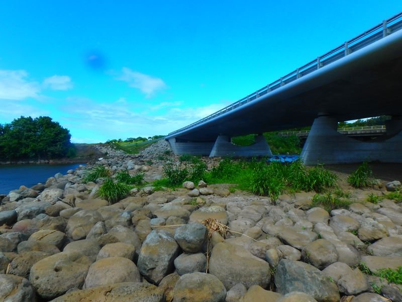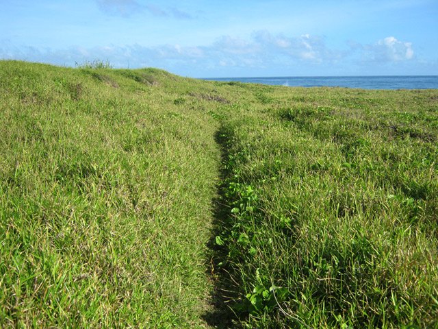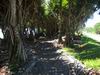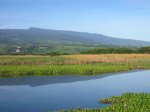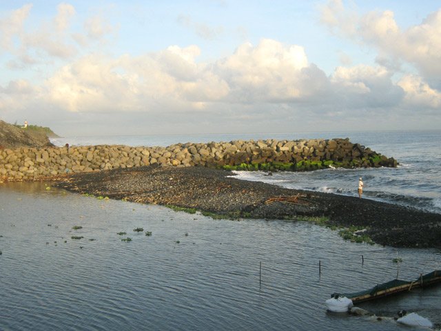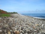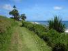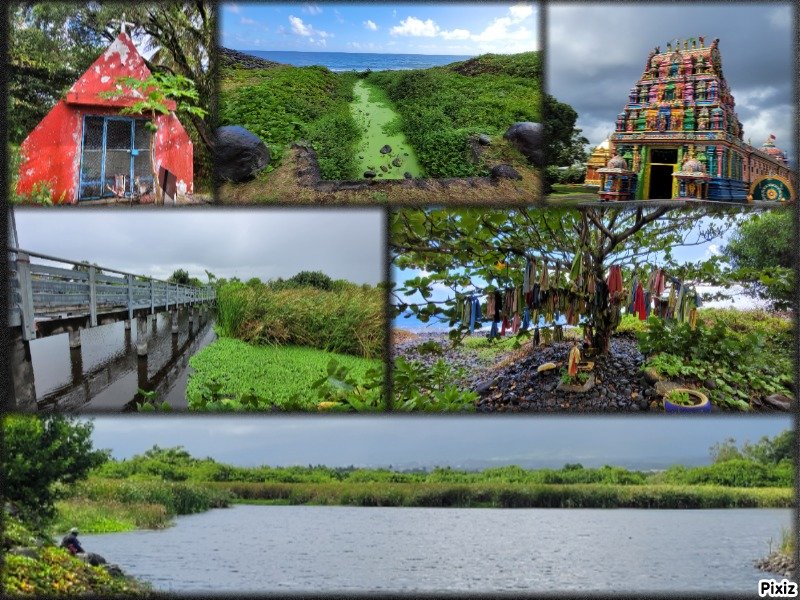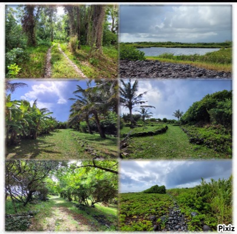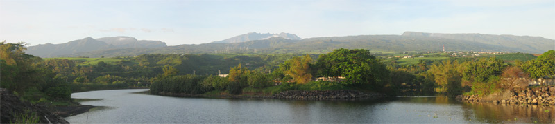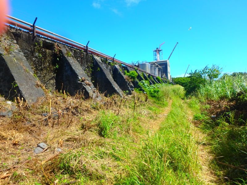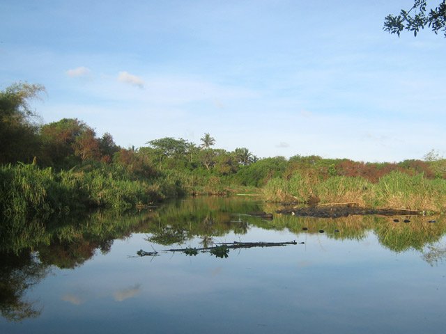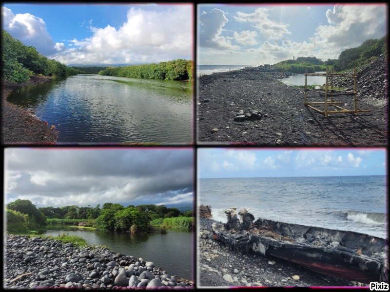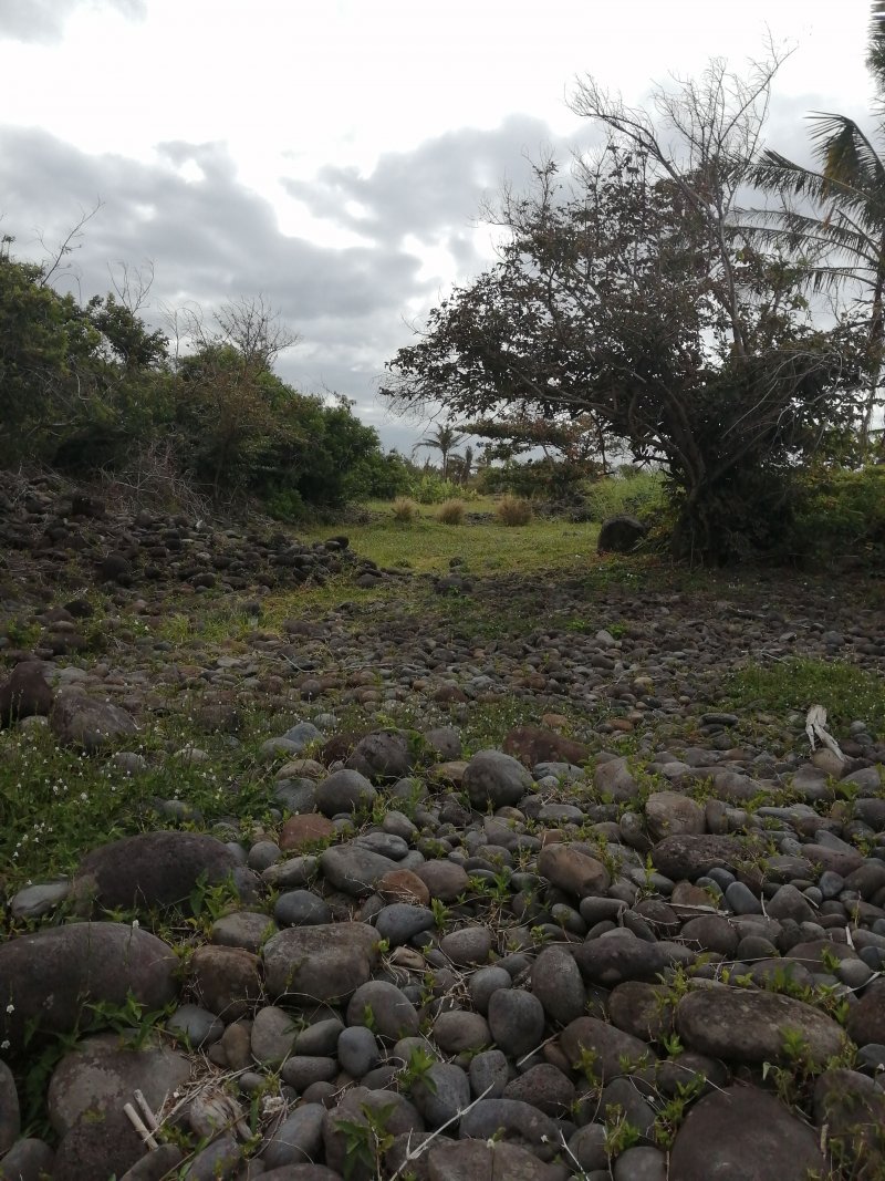 La randonnée débute à la Marine de Sainte-Suzanne, située sur la rive droite de la rivière. Se rapprocher de la déchèterie, non pour y glaner quelques odeurs mais pour profiter du beau point de vue sur les montagnes à partir des berges de la rivière (Photo 1). Il est possible de rejoindre les deux rives par la plage de galets si elle n'est pas trop creusée par les pêcheurs de bichiques et si on vient de Sainte-Marie par la plage (Photo 2). De l'autre côté de la rivière apparaissent quelques installations du parc de loisir du Bocage avec panoramas sur le Gros Morne (Photo 3). Longer la presque totalité de la Rue des Pêcheurs. Après cette route truffée de nids de poules aux alentours de l'école de la Marine et une traversée du village, gagner la plage de galets par une piste caillouteuse qui débute à gauche en face des dernières habitations. Rejoindre rapidement la plage de galets pour une courte traversée jusqu'au delta de la Grande Rivière Saint-Jean. Avec un estuaire en constants changements dus aux mouvements incessants de la mer et de la rivière, difficile de donner un itinéraire précis. Chercher donc le meilleur passage sachant qu'on sera obligé de franchir les pieds dans l'eau. Le débit est variable mais peut être fort. La hauteur d'eau ne dépasse pas les 60 cm, la largeur est très faible et le courant est lié à la force des vagues qui cherchent à envahir la rivière (Photo 4). C'est plus aisé à marée basse. Ce sera la seule occasion de se mouiller durant tout le trajet ; il est donc préférable de se déchausser pour éviter de faire pénétrer le sable dans les chaussures trempées. Une fois la traversée effectuée, on suit un peu la rivière qui ressemble parfois à un petit lac d'eau calme (Photo 5). On se retrouve plus loin face à un grand tas de terre qui marque le début de la déchèterie. Un sentier part vers la gauche et longe les deux usines (distillerie et sucrerie) pour se terminer à la route de Bois Rouge. Il est de plus en plus recouvert d'herbes ou de déchets et il est préférable de monter la butte et de traverser la zone de stockage de containers pour rejoindre une belle piste qui se termine également à la route de Bois Rouge. L'usine est assez longue mais le contournement, quel que soit le trajet emprunté, est rapide (Photo 6). Pas de pancarte d'interdiction de passer. Poursuivre à travers le hameau de Bois Rouge en passant devant le terrain de sport et en marchant jusqu'au petit rond-point en fin de route. Poursuivre sur une piste herbeuse, sous de grands eucalyptus, qui mène presque aux berges de l'étang (Photo 7). La région est une large plaine cultivée de canne à sucre comprenant le grand étang de Bois Rouge (Photo 8). L'endroit est charmant avec ces beaux paysages en direction du Gros Morne et des pitons qui l'entourent (Photo 9). Les jacinthes d'eau ont envahi une grande partie de l'étang (Photo 10). Après avoir profité des reflets du Gros Morne dans les eaux claires, on retrouve très vite une magnifique aire reboisée de petits arbustes et entretenus par l'association 3E (Environnement Est Ecologique ?). Quelques installations sommaires sont construites en bambou mais ne restent pas des années en raison des vents lors des épisodes cycloniques (Photo 12). Plus loin c'est une autre section entretenue par l'Association de Développement du Quartier des Mille Roches qui tond, peint et range les galets le long du chemin (Photo 14). Une piste herbeuse bordées de murets de galets ou de vacoas prolonge ces belles pistes (Photo 15). Un vrai plaisir de marcher ici jusqu'au Petit Etang de Bois Rouge (ou Cambuston, ou Colosse en fonction des gens que l'on rencontre !). On longe les installations de décantation de la station d'épuration sans en être gêné. Des passerelles au-dessus de l'eau couverte de jacinthes sont devenues trop dangereuses et sont désormais interdites au public (Photo 16). Espérons que les planchers seront refaits à neuf dans le cadre du réaménagement du parc du Colosse qui devrait prendre beaucoup de temps. Lorsque c'est possible, la promenade était ludique. Marcher ensuite en bord de mer sur une piste caillouteuse proche de la longue plage de galets (Photo 17). On peut même employer des petits sentiers qui traversent des zones herbeuses (Photo 18). La piste est agréable avec le talus sur la droite qui retient les eaux marécageuses du Petit Etang (Photo 19). A la fin du talus, partir effectuer un court écart vers les berges de l'étang (Photo 20). On rencontre très vite une large et plate piste, peu ombragée (Photo 21) qui se termine à la D47 après avoir longé un champ d'ananas mieux gardé que la prison de Domenjod par des dizaines de tôles ondulées en guise de clôture (Photo 22). Malgré le passage sur la route assez fréquentée, une halte au temple tamoul (Photo 25) ou à la cheminée en ruine permet de diversifier les paysages (Photo 24). L'arbre qui pousse en haut de la cheminée donne l'impression d'une fumée verte qui en sort, poussée par le vent ! Après une minuscule ravine, on trouve d'un simple coup d'œil la piste (Photo 26) qu'on suit sans aucune difficulté jusqu'à un restaurant puis une église en ruine (Photo 27) qui marque la fin du parcours. Ne pas manquer le minuscule cimetière marin dont une partie a été emportée par un cyclone ainsi que l'immense ficus au pied de l'église. Le retour s'effectue par le même itinéraire.