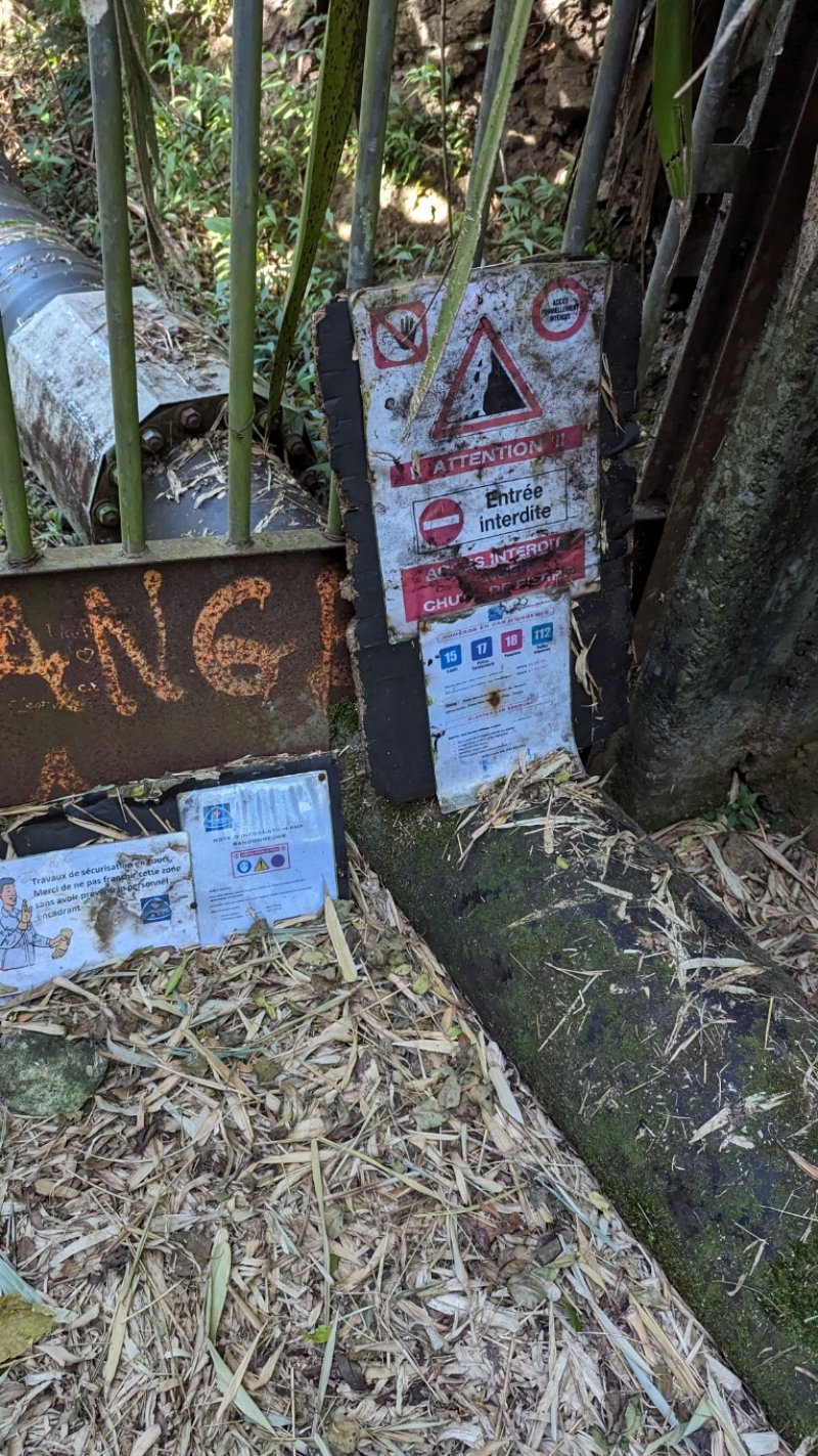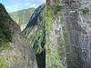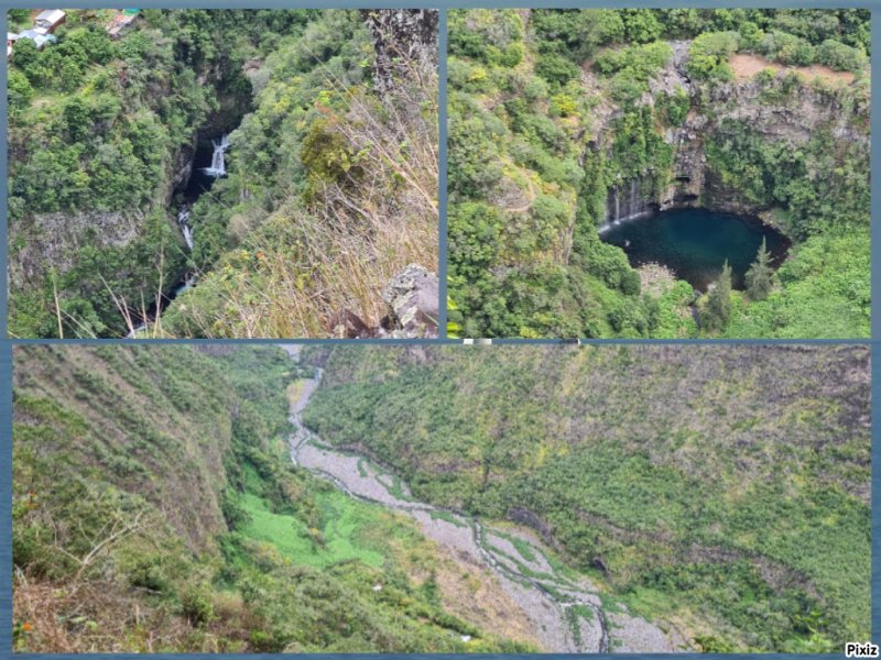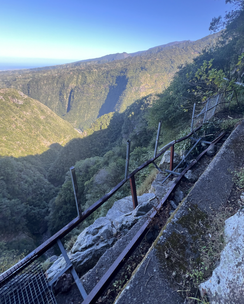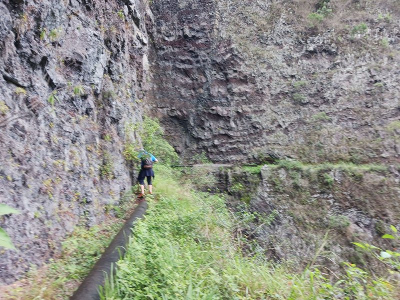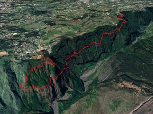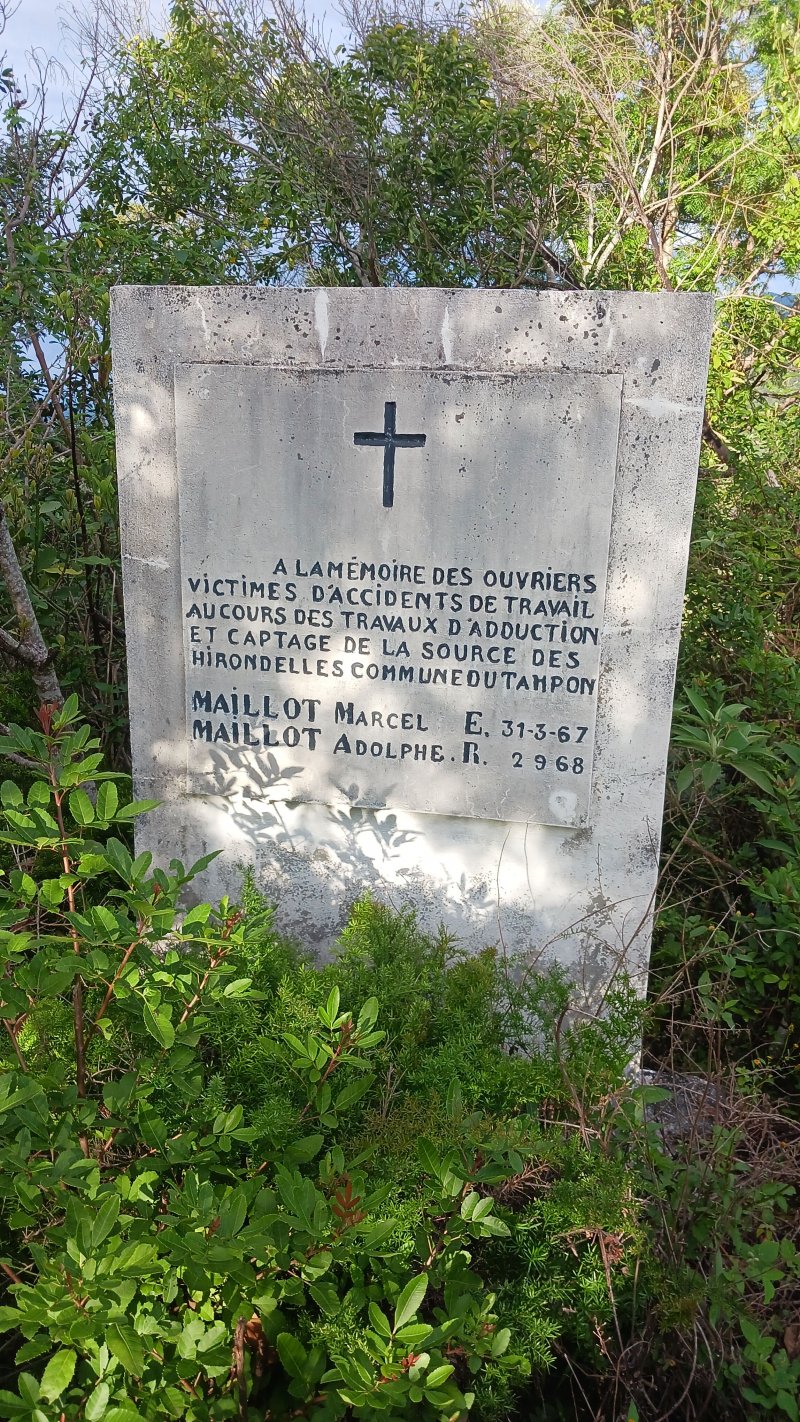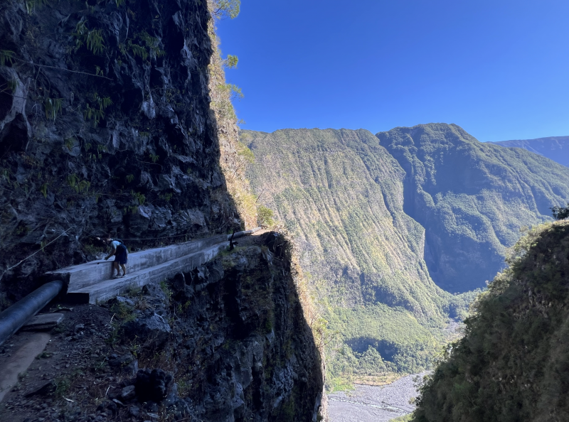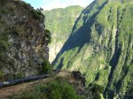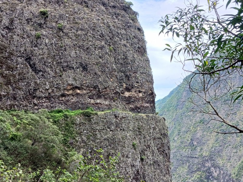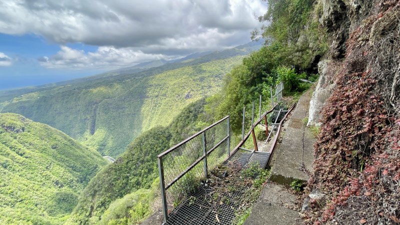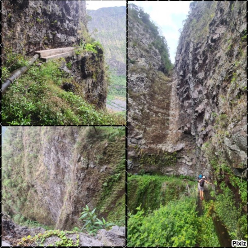 La randonnée débute à Bois Court et emprunte la très connue descente vers Grand Bassin. On peut partir du sentier proche du belvédère ou comme ici au Chemin Thomas Payet. Le premier longe le rempart, l'autre emprunte un sentier qui file droit au rempart. Les deux se rejoignent en début de descente. La pente est immédiate sur escaliers en béton, terre humide, roches et marches en pierre. Quelques rambardes sommaire protègent les parties un peu vertigineuses ou un ancien éboulis (Photo 2). Dans le fond de la vallée, on voit une partie du village de Grand Bassin, le bassin et la cascade du Voile de la Mariée et le Bras des Roches Noires (Photo 3). Après une série de lacets serrés (Photo 4), le sentier oblique sur la droite sur une pente beaucoup plus douce épousant la courbe de niveau. Après un oratoire sur la droite, il descend un peu plus en direction de la station de pompage. On rencontre les premières tuyauteries changées en 2018 par d'importants travaux. Franchir les installations sur des caillebotis métalliques ou des échelles. Les panoramas sur les remparts en face sont sauvages et magnifiques mais on les verra bien mieux dans quelques minutes (Photo 5). La pente s'intensifie sur de nouveaux lacets vers le Petit Coteau. Ne pas manquer, sur la gauche, le sentier qui part en direction de la canalisation des Hirondelles. La jonction jusqu'à la porte qui en interdit l'accès est très rapide. Elle semble impossible à franchir mais comporte sur la gauche des ferrailles soudées afin de constituer une échelle comme pour justement inciter à passer ! Une fois l'obstacle franchi on cheminera durant 6 kilomètres sur un large chemin creusé à même le roc depuis de nombreuses décennies. La pente est pour ainsi dire totalement inexistante et c'est sans effort qu'on chemine sur le flanc de la falaise (Photo 6). Un énorme pied d'ananas du pauvre (Monstera délicieux) recouvre quelques rochers à flanc de falaise (Photo 7). La vallée est étroite et les pitons en rive droite du Bras de la Plaine semblent tout proche (Photo 8). On s'arrête très souvent pour admirer les nombreux panoramas sur la région ; c'est tout d'abord Grand Bassin, ses rivières et cascades, ses vallées encaissées (Photo 10) et tous les pitons alentour. Les virages imposés par la montagne permettent de voir parfois la canalisation au loin et les importants travaux qu'il a fallu réaliser pour alimenter toute une population en eau (Photo 11). Certains travaux ont nécessité de cacher la tuyauterie dans des coffrages bétonnés pour les protéger des chutes fréquentes de roches (Photo 12). D'autres, très impressionnants ont permis son passage sous de hautes cascades (Photo 13). Le sentier bétonné est étroit et très vertigineux (Photo 14). Le moindre faux pas peut être fatal mais, objectivement, la largeur est suffisante pour passer, même pour les jambes flageolantes de certains marcheurs. C'est 300 mètres avant d'y arriver que ce passage fait peur quand on aperçoit la hauteur de la faille, fort heureusement toujours à sec (Photo 15). Une fois cet écueil passé, le parcours est toujours le même sur un sol plat en longeant la canalisation (Photo 16) qui laisse partir parfois des milliers de litres d'eau s'échappant d'une fissure crée par une chute de pierre depuis la falaise. Dans ce cas, le franchissement doit se faire toujours du côté de la canalisation et surtout pas de celui du vide. En face, la très haute faille de la Ravine Mal au Ventre peut abriter de belles cascades en cas de fortes pluies (Photo 19). En fonction des directions imposées par les virages, on a constamment sous les yeux les magnifiques paysages autour de Grand Bassin (Photo 19) ou vers l'aval de la rivière. Peu après la haute cascade à sec, on se retrouve en face de l'Îlet Marron (Photo 20). On distingue très bien le plateau qui abrita cet îlet reculé et surtout le rein dangereux par lequel y on arrive depuis l'Entre Deux (Photo 21). Si l'îlet Marron est depuis longtemps abandonné, il en est autrement des quelques uns qu'on peut deviner au plus près du Bras de la Plaine en les repérant à leur toiture (Photo 22). Plus loin, la vallée entière permet d'en chercher d'autres en amont du barrage qu'on dominera bientôt (Photo 23). L'Îlet Aurélien Dijoux semble très proche quand on le surplombe alors qu'il est situé 400 m plus bas (Photo 24). On rencontre quelques trouées dans la falaise ou d'autres ouvrages bétonnés sans qu'on devine immédiatement leur utilité (Photo 25). Peu après, la canalisation est fixée à la falaise et le sentier disparaît pour être remplacé par une longue passerelle pouvant occasionner certaines appréhensions pour les moins habitués (Photo 26). Cette passerelle souffre régulièrement des chutes de pierre et il faut l'éviter par temps de pluie qui favorise ces chutes (voir ci-dessous le commentaire et photos de Martial le 26/11/2018). La fin du trajet aérien arrive rapidement par le franchissement de la porte grillagée avertissant d'ailleurs des dangers possibles sur le trajet (Photo 27). Plus haut, dans un lacet du Chemin Henry Cabeu, deux grands réservoirs récupèrent l'eau de la canalisation. Si aucun véhicule n'a été prévu près des réservoirs, on peut regagner Bois Court par le Chemin Henry Cabeu qui se termine longtemps plus tard sur la D70, en direction de Bois Court. Cette remontée est un peu longue mais s'effectue entre champs et prairies avec très peu d'habitations.