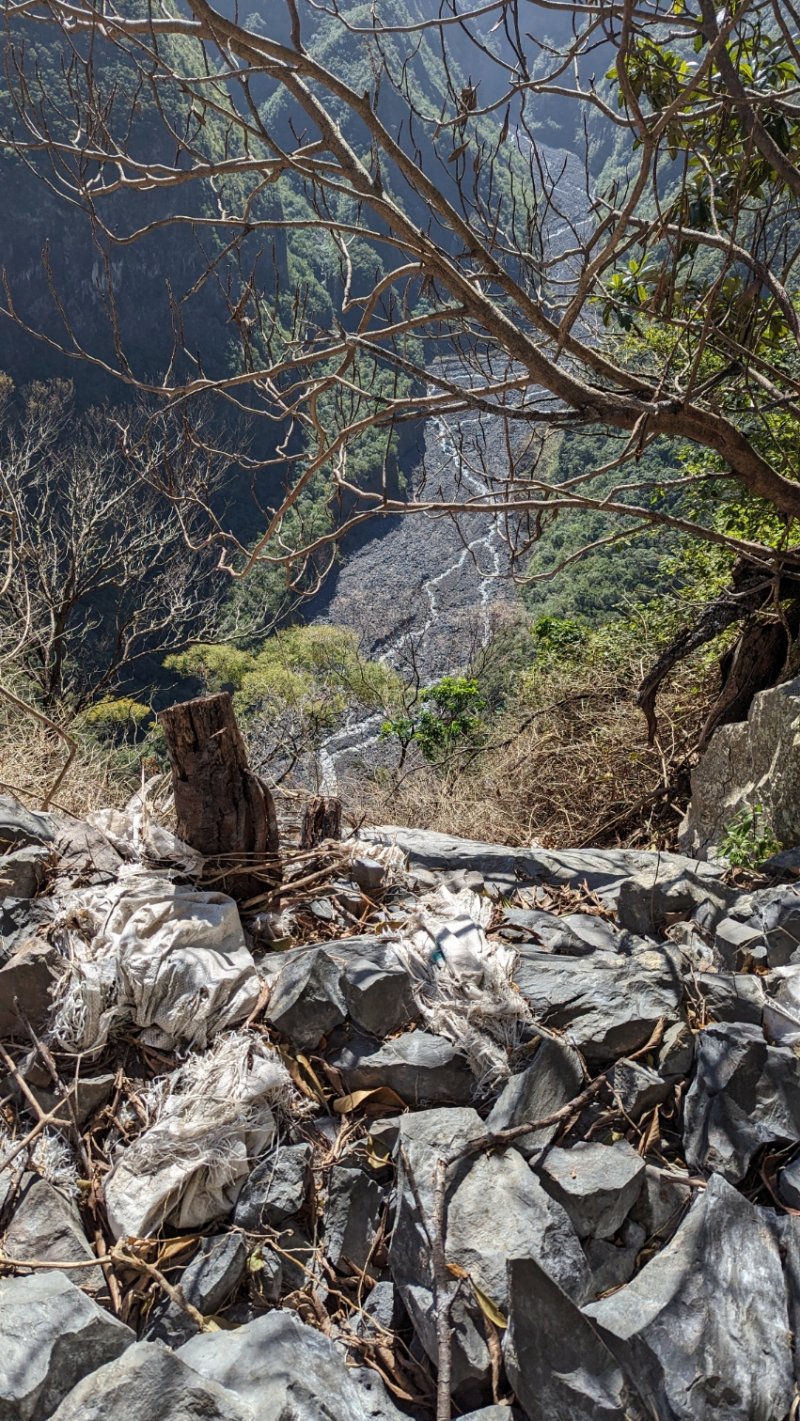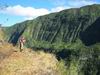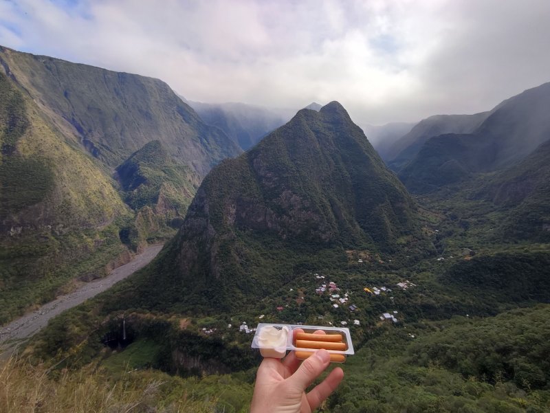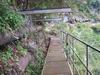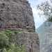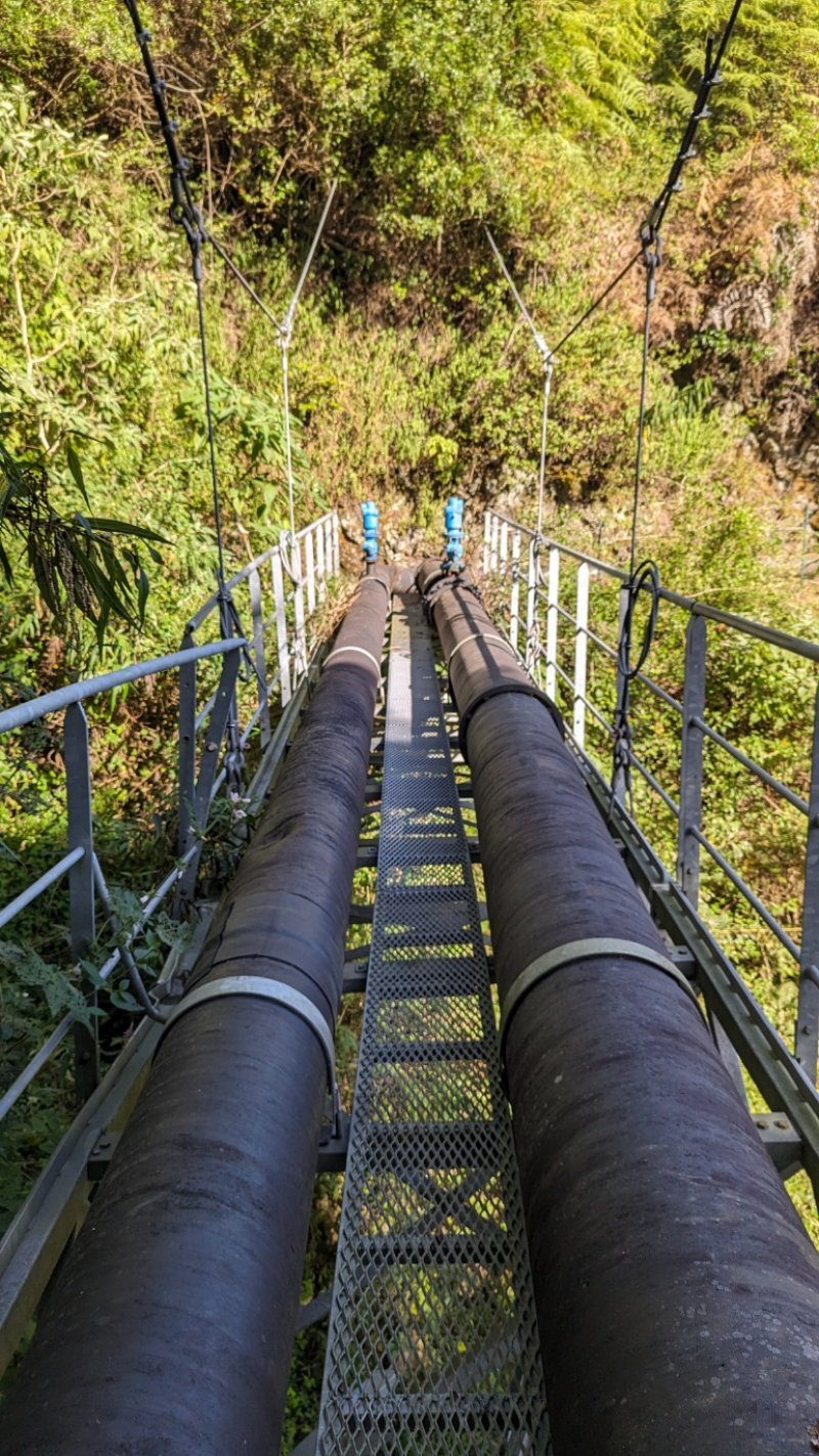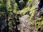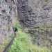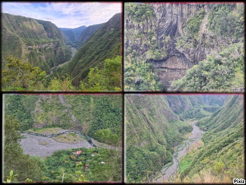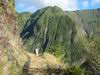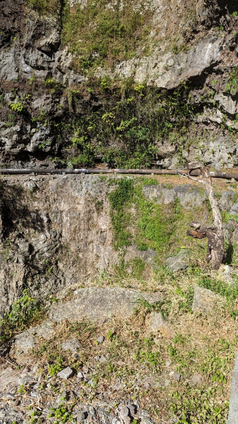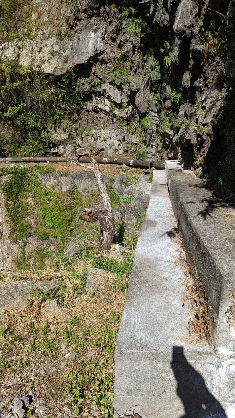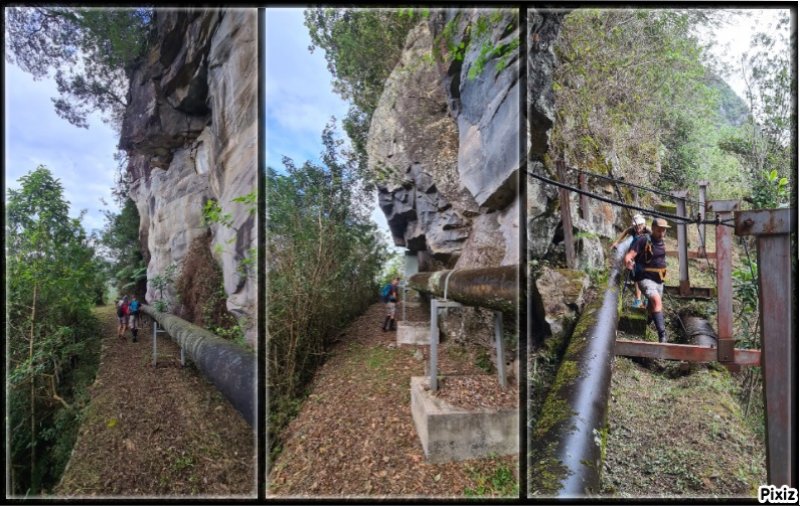 La randonnée débute à Bois Court et emprunte la très connue descente vers Grand Bassin. On peut partir du sentier proche du belvédère ou comme ici au Chemin Thomas Payet. Le premier longe le rempart, l'autre emprunte un sentier qui file droit au rempart. Les deux se rejoignent en début de descente. La pente est immédiate sur escaliers en béton, terre humide, roches et marches en pierre. Quelques rambardes sommaire protègent les parties un peu vertigineuses ou un ancien éboulis (Photo 2). Dans le fond de la vallée, on voit une partie du village de Grand Bassin, le bassin et la cascade du Voile de la Mariée et le Bras des Roches Noires (Photo 3). Après une série de lacets serrés (Photo 4), le sentier oblique sur la droite sur une pente beaucoup plus douce épousant la courbe de niveau. Après un oratoire sur la droite, il descend un peu plus en direction de la station de pompage. On rencontre les premières tuyauteries changées en 2018 par d'importants travaux. Franchir les installations sur des caillebotis métalliques ou des échelles. Les panoramas sur les remparts en face sont sauvages et magnifiques mais on les verra bien mieux dans quelques minutes (Photo 5). La pente s'intensifie sur de nouveaux lacets vers le Petit Coteau. Ne pas manquer, sur la gauche, le sentier qui part en direction de la canalisation des Hirondelles. La jonction jusqu'à la porte qui en interdit l'accès est très rapide. Elle semble impossible à franchir mais comporte sur la gauche des ferrailles soudées afin de constituer une échelle comme pour justement inciter à passer ! Une fois l'obstacle franchi on cheminera durant 6 kilomètres sur un large chemin creusé à même le roc depuis de nombreuses décennies. La pente est pour ainsi dire totalement inexistante et c'est sans effort qu'on chemine sur le flanc de la falaise (Photo 6). Un énorme pied d'ananas du pauvre (Monstera délicieux) recouvre quelques rochers à flanc de falaise (Photo 7). La vallée est étroite et les pitons en rive droite du Bras de la Plaine semblent tout proche (Photo 8). On s'arrête très souvent pour admirer les nombreux panoramas sur la région ; c'est tout d'abord Grand Bassin, ses rivières et cascades, ses vallées encaissées (Photo 10) et tous les pitons alentour. Les virages imposés par la montagne permettent de voir parfois la canalisation au loin et les importants travaux qu'il a fallu réaliser pour alimenter toute une population en eau (Photo 11). Certains travaux ont nécessité de cacher la tuyauterie dans des coffrages bétonnés pour les protéger des chutes fréquentes de roches (Photo 12). D'autres, très impressionnants ont permis son passage sous de hautes cascades (Photo 13). Le sentier bétonné est étroit et très vertigineux (Photo 14). Le moindre faux pas peut être fatal mais, objectivement, la largeur est suffisante pour passer, même pour les jambes flageolantes de certains marcheurs. C'est 300 mètres avant d'y arriver que ce passage fait peur quand on aperçoit la hauteur de la faille, fort heureusement toujours à sec (Photo 15). Une fois cet écueil passé, le parcours est toujours le même sur un sol plat en longeant la canalisation (Photo 16) qui laisse partir parfois des milliers de litres d'eau s'échappant d'une fissure crée par une chute de pierre depuis la falaise. Dans ce cas, le franchissement doit se faire toujours du côté de la canalisation et surtout pas de celui du vide. En face, la très haute faille de la Ravine Mal au Ventre peut abriter de belles cascades en cas de fortes pluies (Photo 19). En fonction des directions imposées par les virages, on a constamment sous les yeux les magnifiques paysages autour de Grand Bassin (Photo 19) ou vers l'aval de la rivière. Peu après la haute cascade à sec, on se retrouve en face de l'Îlet Marron (Photo 20). On distingue très bien le plateau qui abrita cet îlet reculé et surtout le rein dangereux par lequel y on arrive depuis l'Entre Deux (Photo 21). Si l'îlet Marron est depuis longtemps abandonné, il en est autrement des quelques uns qu'on peut deviner au plus près du Bras de la Plaine en les repérant à leur toiture (Photo 22). Plus loin, la vallée entière permet d'en chercher d'autres en amont du barrage qu'on dominera bientôt (Photo 23). L'Îlet Aurélien Dijoux semble très proche quand on le surplombe alors qu'il est situé 400 m plus bas (Photo 24). On rencontre quelques trouées dans la falaise ou d'autres ouvrages bétonnés sans qu'on devine immédiatement leur utilité (Photo 25). Peu après, la canalisation est fixée à la falaise et le sentier disparaît pour être remplacé par une longue passerelle pouvant occasionner certaines appréhensions pour les moins habitués (Photo 26). Cette passerelle souffre régulièrement des chutes de pierre et il faut l'éviter par temps de pluie qui favorise ces chutes (voir ci-dessous le commentaire et photos de Martial le 26/11/2018). La fin du trajet aérien arrive rapidement par le franchissement de la porte grillagée avertissant d'ailleurs des dangers possibles sur le trajet (Photo 27). Plus haut, dans un lacet du Chemin Henry Cabeu, deux grands réservoirs récupèrent l'eau de la canalisation. Si aucun véhicule n'a été prévu près des réservoirs, on peut regagner Bois Court par le Chemin Henry Cabeu qui se termine longtemps plus tard sur la D70, en direction de Bois Court. Cette remontée est un peu longue mais s'effectue entre champs et prairies avec très peu d'habitations.