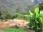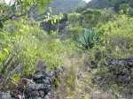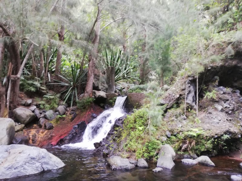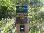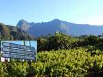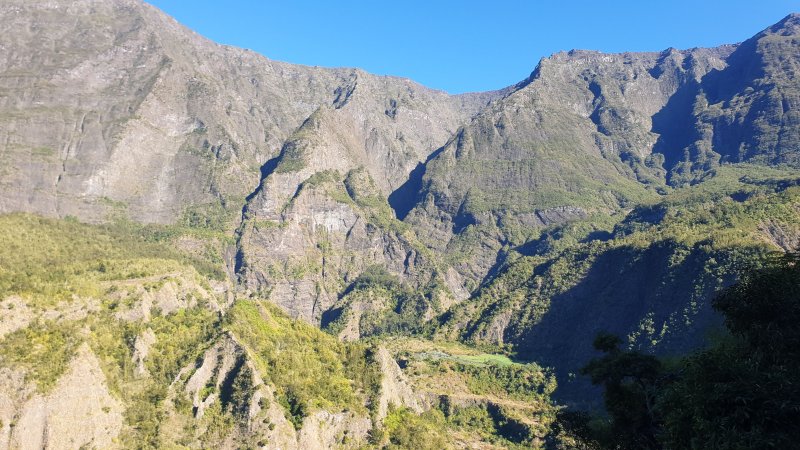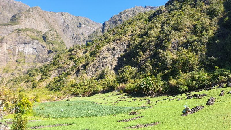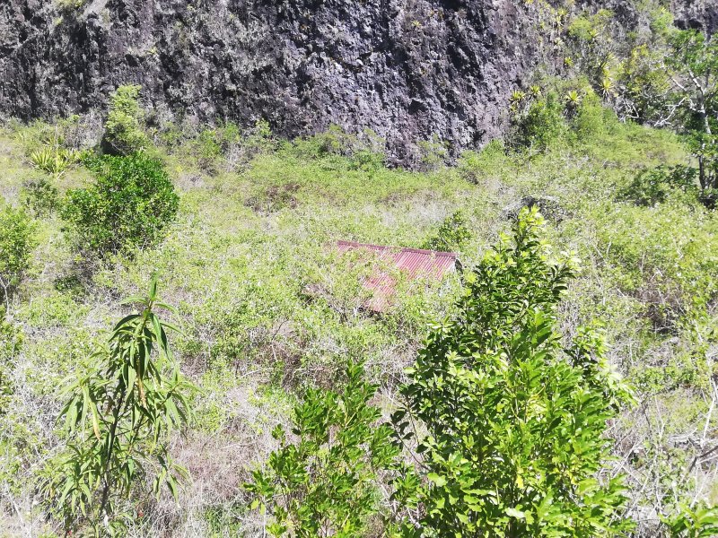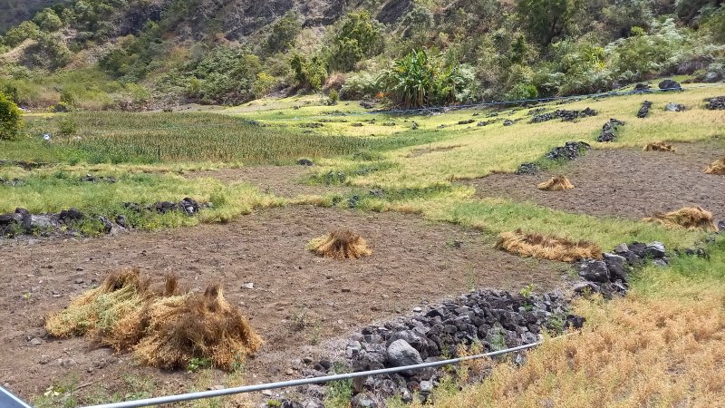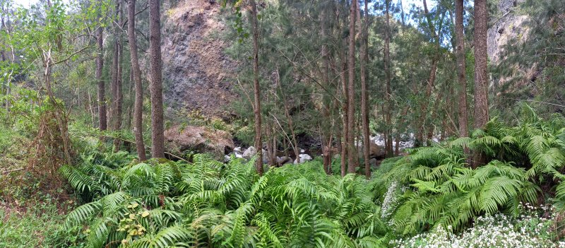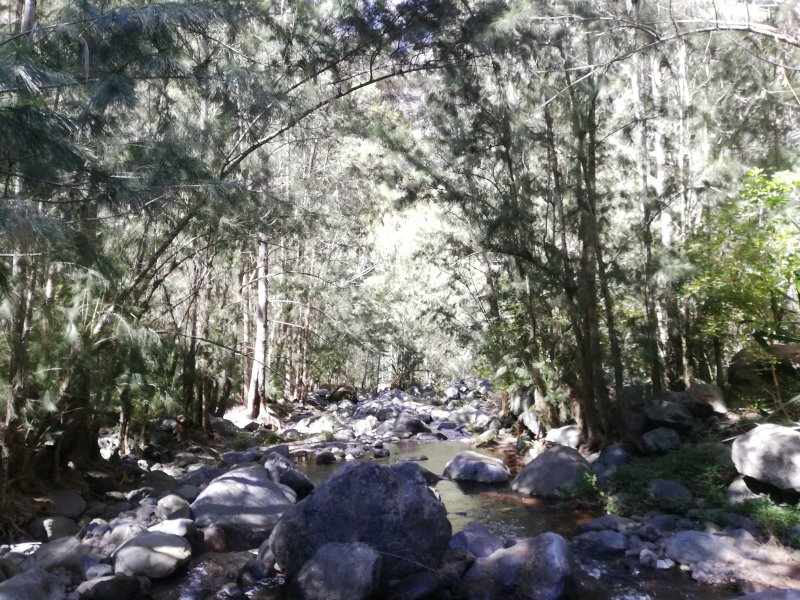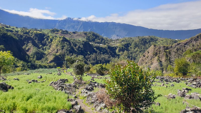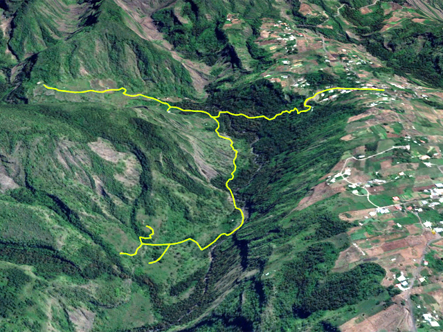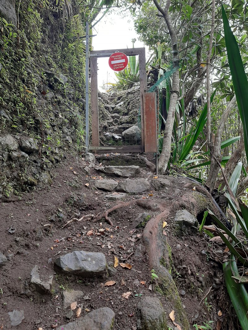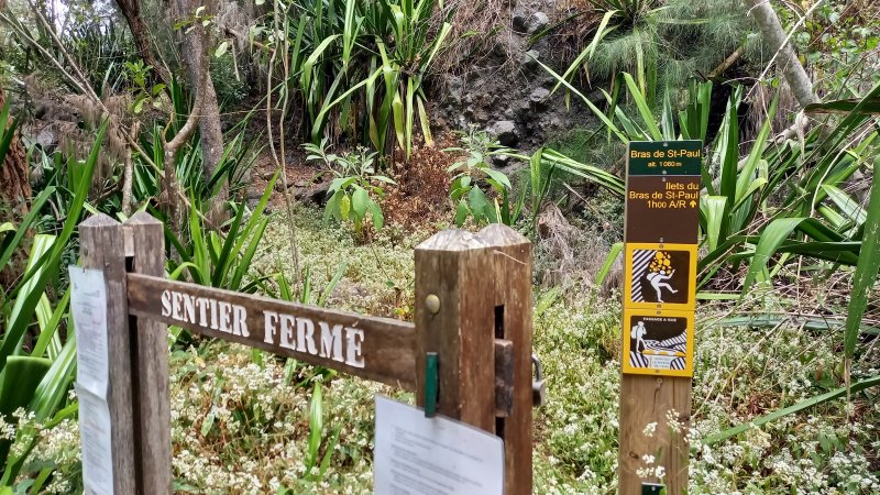 La randonnée débute à l'Îlet à Cordes, presque à la fin de l'agréable Chemin Figaro offrant de belles vues sur le village et le Grand Bénare (Photo 1). Le Chemin du Bras de Saint-Paul, sur la droite, entame sa descente en longeant quelques habitations. Des panneaux annoncent quelques îlets même si plus personne n'y habite (Photo 2). Vers la droite on bénéficie des premiers points de vue au-dessus des champs de lentilles, de haricots ou de quelques vignes qui subsistent. On peut également repérer l'Îlet du Grand Coude qu'on rejoindra dans peu de temps, dominé par les remparts infranchissables du Grand Bénare (Photo 3). Un escalier en béton mène au début du sentier reconnaissable aux deux poteaux de fermeture par l'ONF (Photo 4). On descend sur un agréable sentier fait parfois de hautes marches en pierre, de courts lacets ou de passages en corniche. Au début, des travaux d'adduction permettent de bénéficier d'une centaine de mètres sur béton, marches ou parapets (Photo 5). Quelques eucalyptus bordent le sentier assez souvent caillouteux (Photo 6). La distance est courte, la descente rapide et l'on arrive sans effort sous les filaos bordant le Bras de Saint-Paul (Photo 7). Le ruisseau est assez calme, surtout encombré de rochers et comporte peu de bassins (Photo 8). On peut réserver du temps au retour pour remonter le bras et voir la cascade qui termine le Bras l'Eustache en amont ou voir quelques bassins en aval. Traverser le gué, assez facile sur les roches puis grimper et rejoindre 25 mètres plus loin le croisement de sentiers. Partir à droite en marchant sous les filaos sur un sentier large, en très bon état (Photo 9). On parvient rapidement au Bras Crochet qui se traverse également sans difficulté. Le sentier remonte ensuite vers l'Îlet historique du Bras de Saint-Paul à travers les treilles de chouchous qui ont envahi tous les sous-bois. Il devient humide et se sépare en deux. L'itinéraire vers la droite amène à une petite propriété privée bien entretenue où des chiens bruyants servent d'alarme. Poursuivre sous les bananiers détrempés et tenter de pénétrer de quelques mètres dans ce qui était un îlet cultivé, désormais recouvert de végétation qui nécessiterait des mois de travail pour le remettre en état (Photo 10). Poursuivre vers l'ouest en direction d'une petite falaise qui se franchit par quelques marches à travers les galaberts. Depuis le haut de ce grand talus, on imagine alors ce qu'était ce lieu en 2015 lorsqu'il était cultivé (Photo 11). On ne voit même plus les maisonnettes en pierre déjà recouvertes de verdure. La montée reprend sur un terrain couvert en partie de galaberts et d'herbe. Le sentier est étroit mais facile à suivre (Photo 12). Il effectue une courbe pour se rapprocher d'anciennes habitations. On longe ensuite des champs de lentilles bien entretenus et traversés par une longue canalisation. On se rapproche enfin de la petite case d'habitation entourée de bananiers, d'arbres fruitiers et de fleurs (Photo 13). Revenir vers le Bras Crochet en profitant de ces champs cultivés et propres car ce seront les derniers de la sortie. Après avoir rejoint le croisement marqué de son poteau ONF, poursuivre tout droit sur le sentier balisé de blanc. Cependant, ne pas trop chercher les traces de peinture car le sentier est bordé de nombreuses invasives (Photo 14). Il traverse des friches, des zones d'herbes sèches ou couvertes d'aiguilles de filaos (Photo 15). Le sentier qui passait en rive droite et parfois en corniche est désormais impossible à emprunter (voir ci-dessous). On est donc obligé de suivre la rivière dans une vallée plus ou moins étroite (Photo 17). On frôle l'ancienne passerelle qui a chuté d'une quinzaine de mètres. Il faut ainsi franchir plusieurs gués pour suivre le tracé balisé (Photo 18). Pour retrouver le sentier remontant au plateau, le repérer au dernier gué juste avant un bassin d'eau calme (Photo 19). Dix mètres avant le bassin, le sentier oblique sur la droite, remonte fortement dans le rempart, se rapproche d'une passerelle puis parvient au plateau. Une zone plane, cultivée il y a quelques décennies est désormais infranchissable sans machette. La case est une ruine d'où l'on entend très bien couler la rivière un peu plus bas (Photo 20). Le sentier remonte un peu vers le nord en longeant d'anciens murets (Photo 21). Certains sont encore en bon état malgré les arbres et arbustes qui les repoussent (Photo 22). On parvient au dernier poteau annonçant le point de retour (Photo 23). Deux solutions : revenir à l'Îlet à Cordes par le même itinéraire ou poursuivre un peu pour s'approcher d'une ravine caillouteuse au pied de deux petits plateaux. Les ruines sont partout mais recouvertes de colle-colle Desmodium intertum : plante invasive collante qui s'attache à tout ce qui passe et laisse sur les vêtements des centaines de graines. Voir §ci-dessous. (Photo 24). Marcher dans le fond de la ravine jusqu'à la barrière d'époque installée là pour décourager les visiteurs. On peut désormais la franchir impunément. Monter sur les pierres puis prendre un beau petit sentier qui mène au plateau le plus au nord. Attention à l'éboulis qui a fait chuter un rocher de plusieurs dizaines de tonnes en équilibre précaire sur le bord du plateau (Photo 25). Une case délabrée demeure, mais plus aucune trace de culture. Revenir sur ses pas, rejoindre la ravine puis prendre le sentier partant sur la droite. On arrive à un îlet encore habité en 2015, devenu méconnaissable après son abandon. Les colle-colle ont pris possession des lieux (Photo 26), inutile d'essayer de rejoindre le cabanon en ruine (Photo 27). Rejoindre le sentier désormais difficile à suivre et terminer cette recherche d'îlets perdus par une courte descente vers une cabane toujours sur pied (Photo 28). Si la case en tôle semble encore correcte, impossible là aussi de repérer d'anciennes