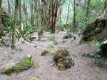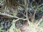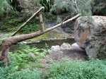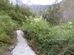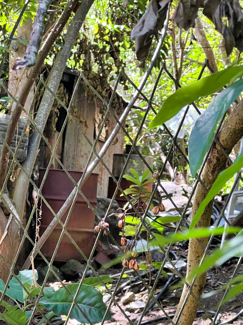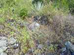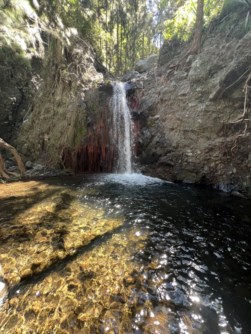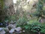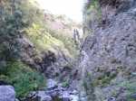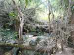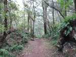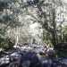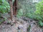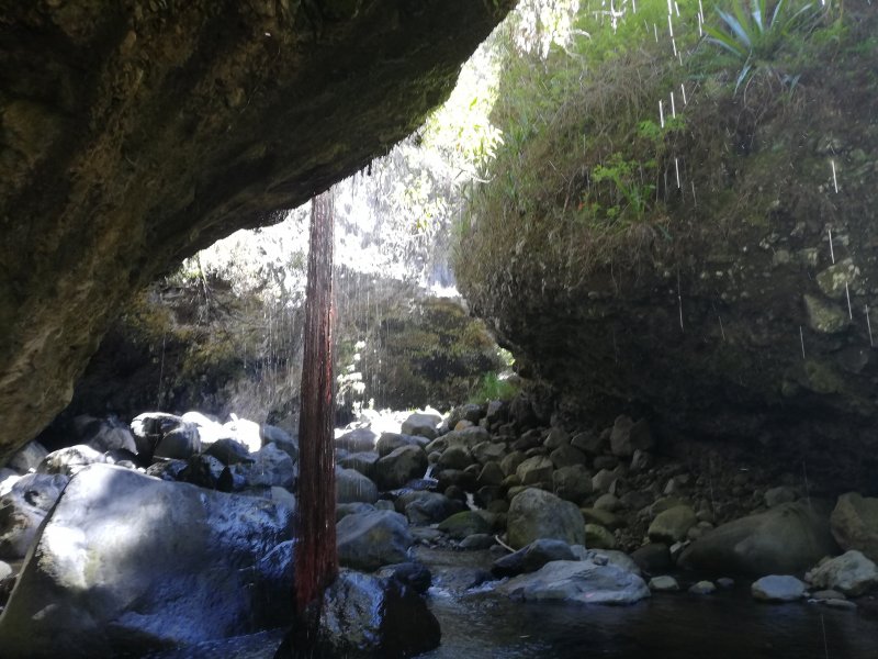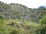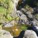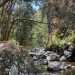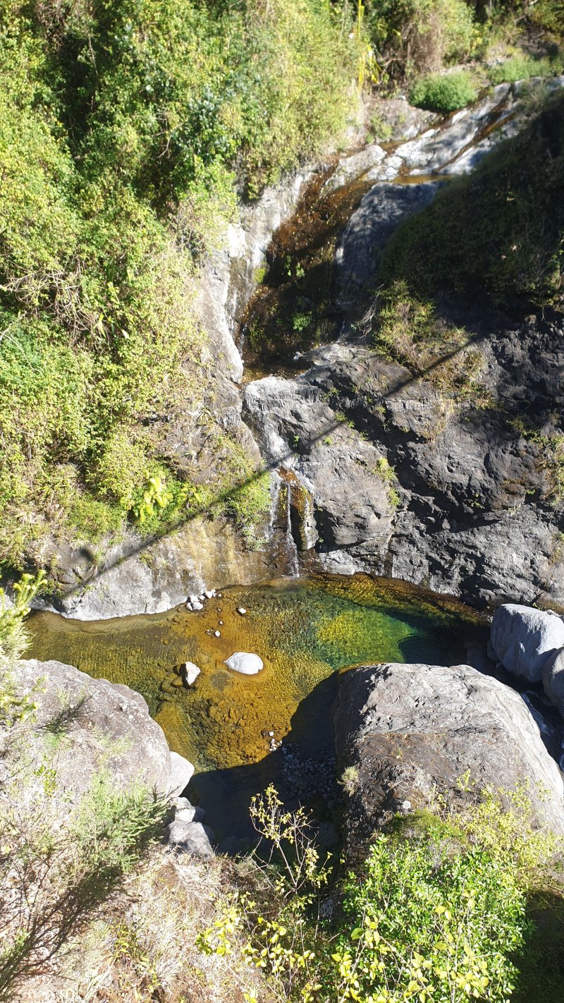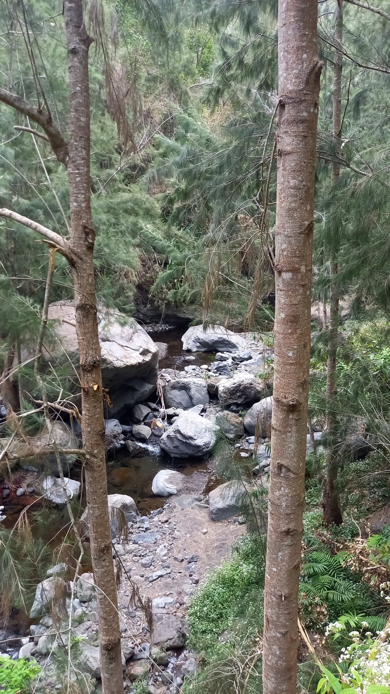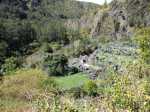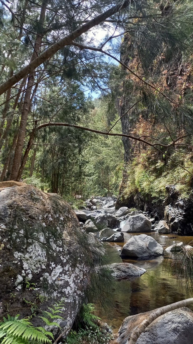 La randonnée débute à l'Îlet à Cordes, presque à la fin de l'agréable Chemin Figaro offrant de belles vues sur le village et le Grand Bénare (Photo 1). Le Chemin du Bras de Saint-Paul, sur la droite, entame sa descente en longeant quelques habitations. Des panneaux annoncent quelques îlets même si plus personne n'y habite (Photo 2). Vers la droite on bénéficie des premiers points de vue au-dessus des champs de lentilles, de haricots ou de quelques vignes qui subsistent. On peut également repérer l'Îlet du Grand Coude qu'on rejoindra dans peu de temps, dominé par les remparts infranchissables du Grand Bénare (Photo 3). Un escalier en béton mène au début du sentier reconnaissable aux deux poteaux de fermeture par l'ONF (Photo 4). On descend sur un agréable sentier fait parfois de hautes marches en pierre, de courts lacets ou de passages en corniche. Au début, des travaux d'adduction permettent de bénéficier d'une centaine de mètres sur béton, marches ou parapets (Photo 5). Quelques eucalyptus bordent le sentier assez souvent caillouteux (Photo 6). La distance est courte, la descente rapide et l'on arrive sans effort sous les filaos bordant le Bras de Saint-Paul (Photo 7). Le ruisseau est assez calme, surtout encombré de rochers et comporte peu de bassins (Photo 8). On peut réserver du temps au retour pour remonter le bras et voir la cascade qui termine le Bras l'Eustache en amont ou voir quelques bassins en aval. Traverser le gué, assez facile sur les roches puis grimper et rejoindre 25 mètres plus loin le croisement de sentiers. Partir à droite en marchant sous les filaos sur un sentier large, en très bon état (Photo 9). On parvient rapidement au Bras Crochet qui se traverse également sans difficulté. Le sentier remonte ensuite vers l'Îlet historique du Bras de Saint-Paul à travers les treilles de chouchous qui ont envahi tous les sous-bois. Il devient humide et se sépare en deux. L'itinéraire vers la droite amène à une petite propriété privée bien entretenue où des chiens bruyants servent d'alarme. Poursuivre sous les bananiers détrempés et tenter de pénétrer de quelques mètres dans ce qui était un îlet cultivé, désormais recouvert de végétation qui nécessiterait des mois de travail pour le remettre en état (Photo 10). Poursuivre vers l'ouest en direction d'une petite falaise qui se franchit par quelques marches à travers les galaberts. Depuis le haut de ce grand talus, on imagine alors ce qu'était ce lieu en 2015 lorsqu'il était cultivé (Photo 11). On ne voit même plus les maisonnettes en pierre déjà recouvertes de verdure. La montée reprend sur un terrain couvert en partie de galaberts et d'herbe. Le sentier est étroit mais facile à suivre (Photo 12). Il effectue une courbe pour se rapprocher d'anciennes habitations. On longe ensuite des champs de lentilles bien entretenus et traversés par une longue canalisation. On se rapproche enfin de la petite case d'habitation entourée de bananiers, d'arbres fruitiers et de fleurs (Photo 13). Revenir vers le Bras Crochet en profitant de ces champs cultivés et propres car ce seront les derniers de la sortie. Après avoir rejoint le croisement marqué de son poteau ONF, poursuivre tout droit sur le sentier balisé de blanc. Cependant, ne pas trop chercher les traces de peinture car le sentier est bordé de nombreuses invasives (Photo 14). Il traverse des friches, des zones d'herbes sèches ou couvertes d'aiguilles de filaos (Photo 15). Le sentier qui passait en rive droite et parfois en corniche est désormais impossible à emprunter (voir ci-dessous). On est donc obligé de suivre la rivière dans une vallée plus ou moins étroite (Photo 17). On frôle l'ancienne passerelle qui a chuté d'une quinzaine de mètres. Il faut ainsi franchir plusieurs gués pour suivre le tracé balisé (Photo 18). Pour retrouver le sentier remontant au plateau, le repérer au dernier gué juste avant un bassin d'eau calme (Photo 19). Dix mètres avant le bassin, le sentier oblique sur la droite, remonte fortement dans le rempart, se rapproche d'une passerelle puis parvient au plateau. Une zone plane, cultivée il y a quelques décennies est désormais infranchissable sans machette. La case est une ruine d'où l'on entend très bien couler la rivière un peu plus bas (Photo 20). Le sentier remonte un peu vers le nord en longeant d'anciens murets (Photo 21). Certains sont encore en bon état malgré les arbres et arbustes qui les repoussent (Photo 22). On parvient au dernier poteau annonçant le point de retour (Photo 23). Deux solutions : revenir à l'Îlet à Cordes par le même itinéraire ou poursuivre un peu pour s'approcher d'une ravine caillouteuse au pied de deux petits plateaux. Les ruines sont partout mais recouvertes de colle-colle Desmodium intertum : plante invasive collante qui s'attache à tout ce qui passe et laisse sur les vêtements des centaines de graines. Voir §ci-dessous. (Photo 24). Marcher dans le fond de la ravine jusqu'à la barrière d'époque installée là pour décourager les visiteurs. On peut désormais la franchir impunément. Monter sur les pierres puis prendre un beau petit sentier qui mène au plateau le plus au nord. Attention à l'éboulis qui a fait chuter un rocher de plusieurs dizaines de tonnes en équilibre précaire sur le bord du plateau (Photo 25). Une case délabrée demeure, mais plus aucune trace de culture. Revenir sur ses pas, rejoindre la ravine puis prendre le sentier partant sur la droite. On arrive à un îlet encore habité en 2015, devenu méconnaissable après son abandon. Les colle-colle ont pris possession des lieux (Photo 26), inutile d'essayer de rejoindre le cabanon en ruine (Photo 27). Rejoindre le sentier désormais difficile à suivre et terminer cette recherche d'îlets perdus par une courte descente vers une cabane toujours sur pied (Photo 28). Si la case en tôle semble encore correcte, impossible là aussi de repérer d'anciennes
